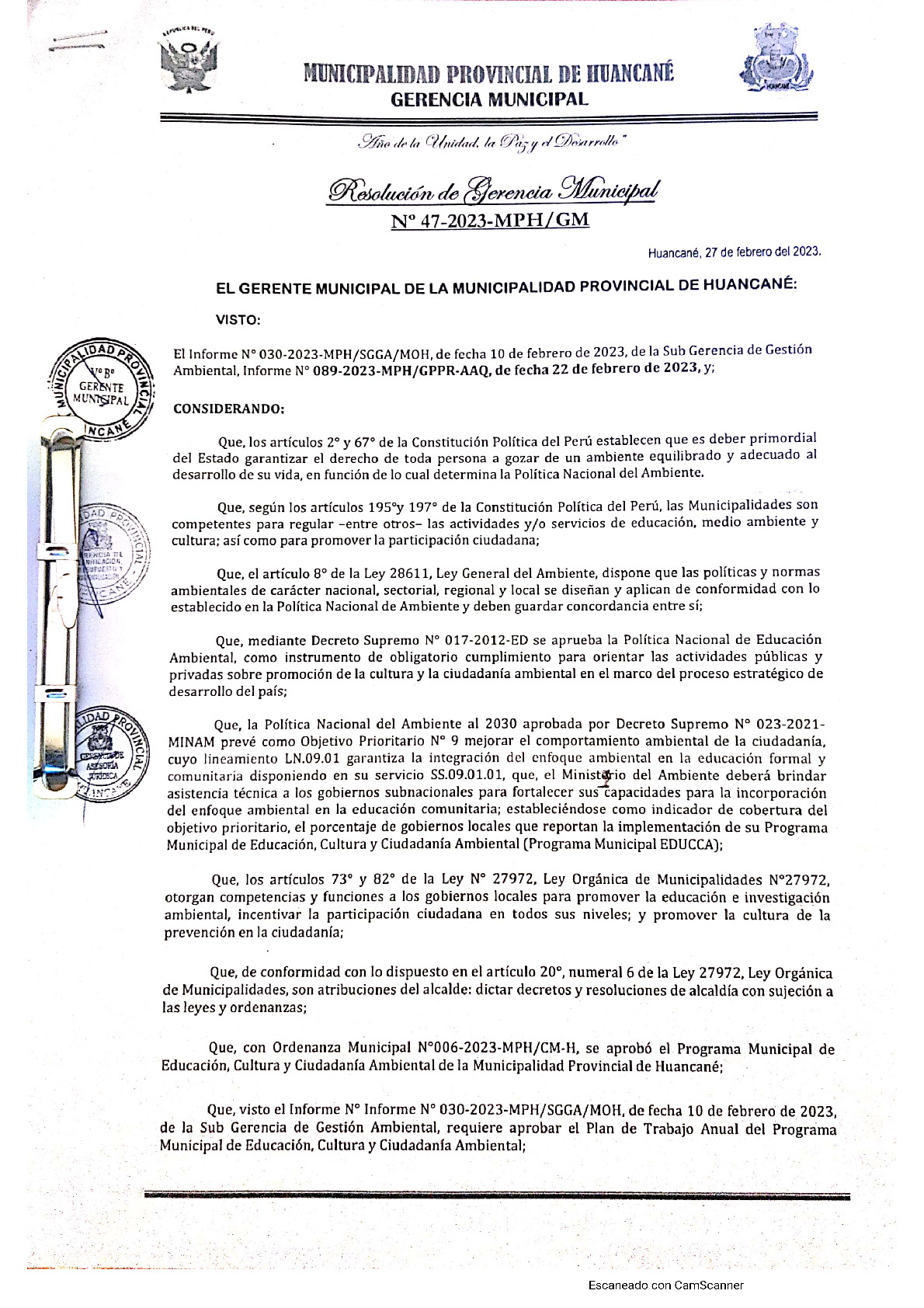 La presente Resolución de Gerencia Municipal aprueba el Plan de Trabajo 2023 del Programa Municipal de Educación, Cultura y Ciudadanía Ambiental de la Municipalidad Provincial de Huancané (Puno), con la finalidad de definir las actividades de educación, cultura y ciudadanía ambiental que se desarrollaran en la localidad durante el presente año.