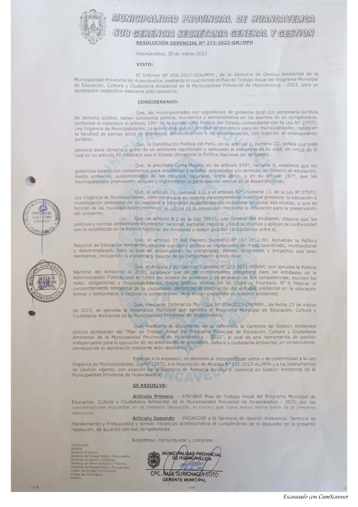 La presente Resolución de Gerencia Municipal aprueba el Plan de Trabajo 2023 del Programa Municipal de Educación, Cultura y Ciudadanía Ambiental de la Municipalidad Provincial de Huancavelica (Huancavelica), con la finalidad de definir las actividades de educación, cultura y ciudadanía ambiental que se desarrollaran en la localidad durante el presente año.