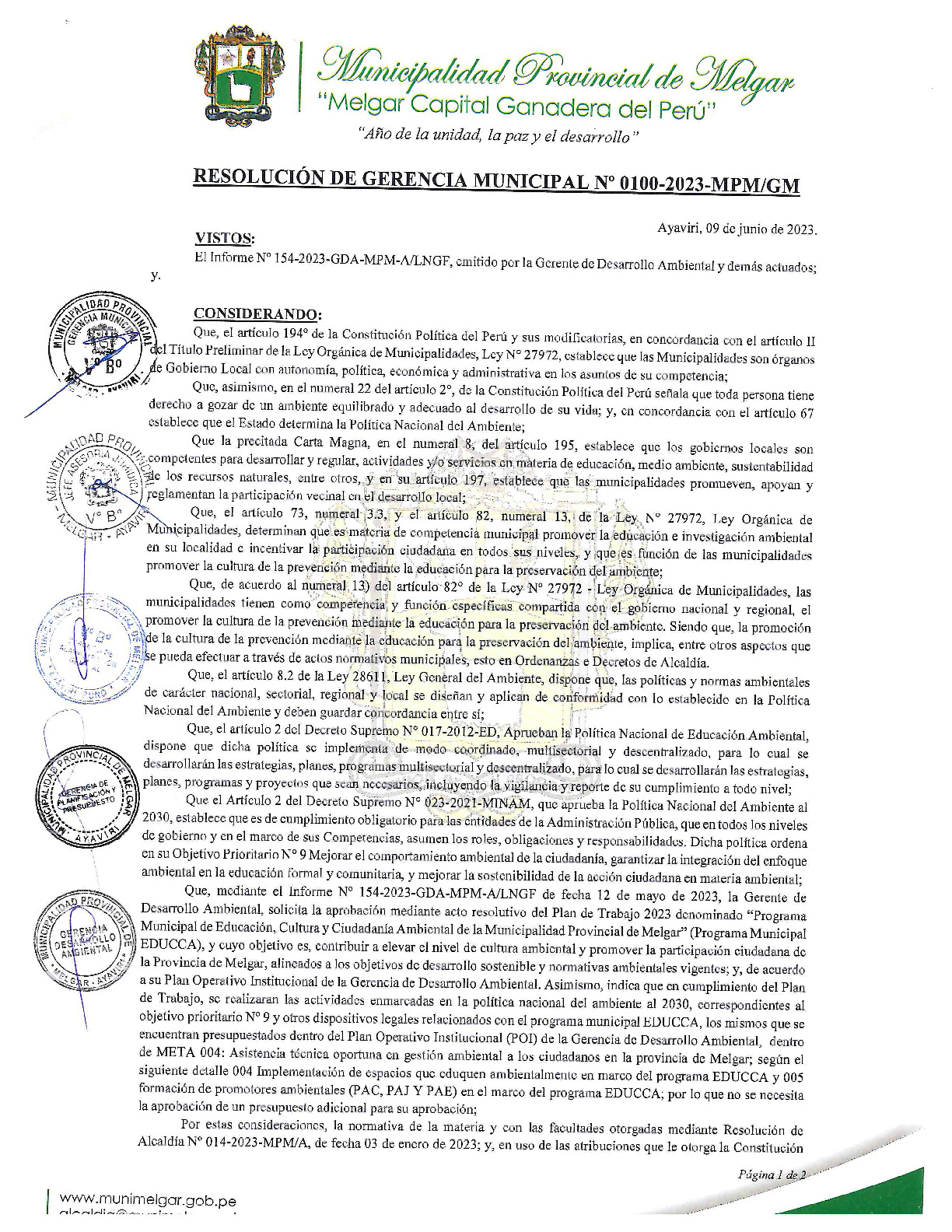 La presente Resolución de Gerencia Municipal aprueba el Plan de Trabajo 2023 del Programa Municipal de Educación, Cultura y Ciudadanía Ambiental de la Municipalidad Provincial de Melgar (Puno), con la finalidad de definir las actividades de educación, cultura y ciudadanía ambiental que se desarrollaran en la localidad durante el presente año.
