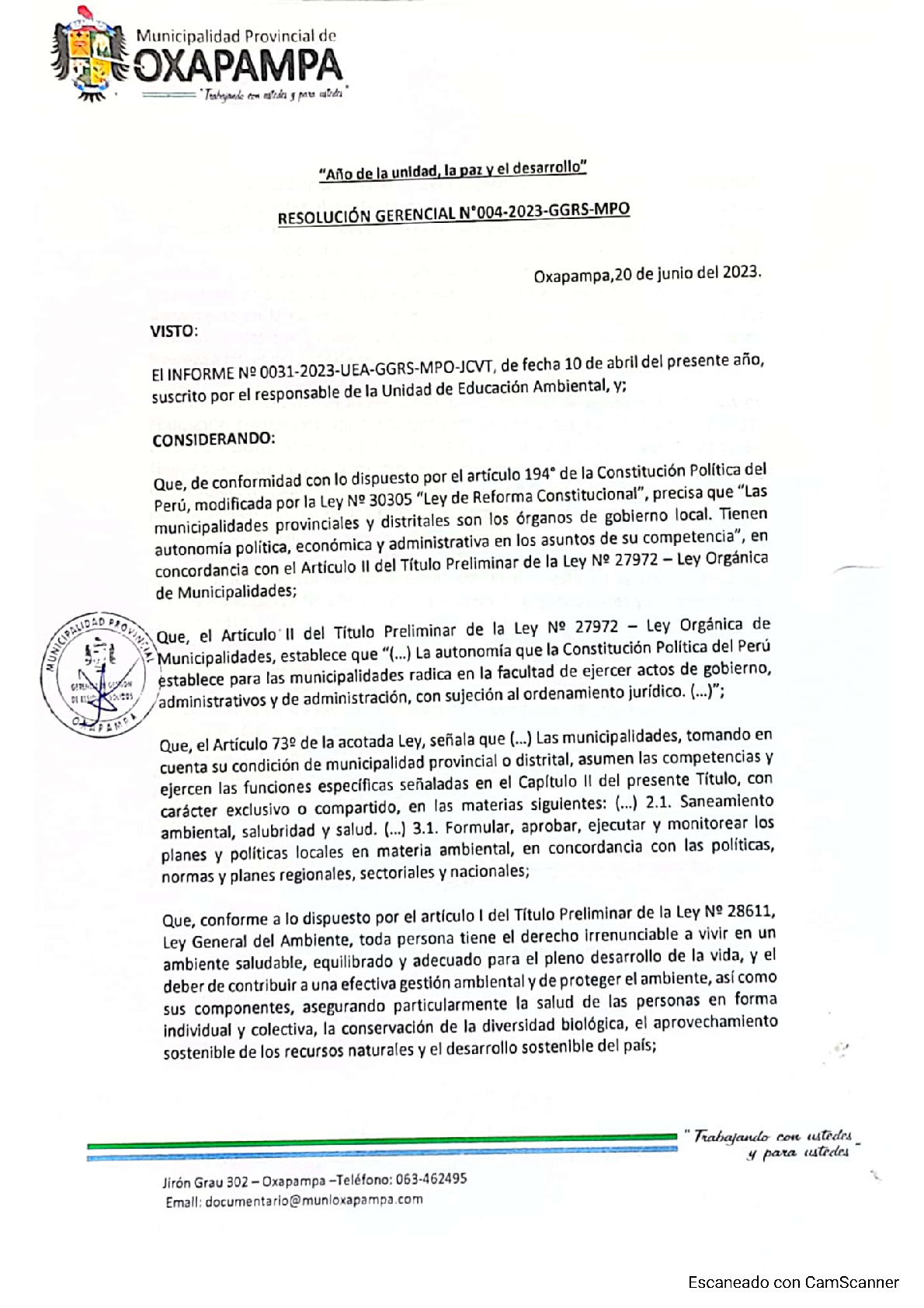 La presente Resolución de Gerencia Municipal aprueba el Plan de Trabajo 2023 del Programa Municipal de Educación, Cultura y Ciudadanía Ambiental de la Municipalidad Provincial de Oxapampa (Pasco), con la finalidad de definir las actividades de educación, cultura y ciudadanía ambiental que se desarrollaran en la localidad durante el presente año.