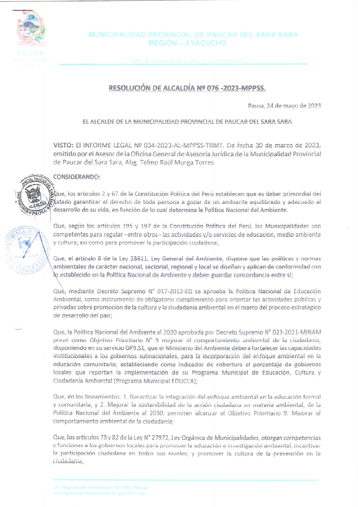 La presente Resolución de Alcaldía aprueba el Plan de Trabajo 2023 del Programa Municipal de Educación, Cultura y Ciudadanía Ambiental de la Municipalidad Provincial de Paucar del Sara Sara (Ayacucho), con la finalidad de definir las actividades de educación, cultura y ciudadanía ambiental que se desarrollaran en la localidad durante el presente año.