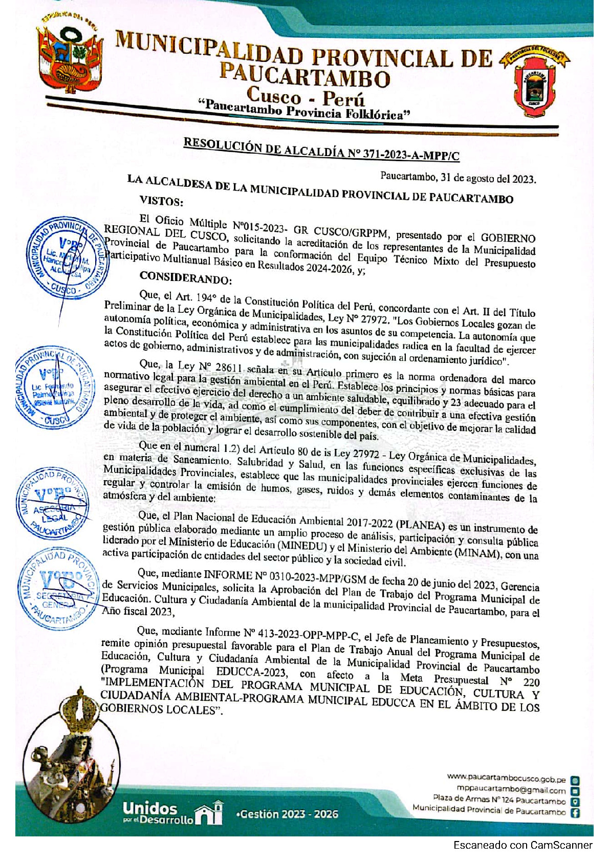 La presente Resolución de Alcaldía aprueba el Plan de Trabajo 2023 del Programa Municipal de Educación, Cultura y Ciudadanía Ambiental de la Municipalidad Provincial de Paucartambo (Cusco), con la finalidad de definir las actividades de educación, cultura y ciudadanía ambiental que se desarrollaran en la localidad durante el presente año.