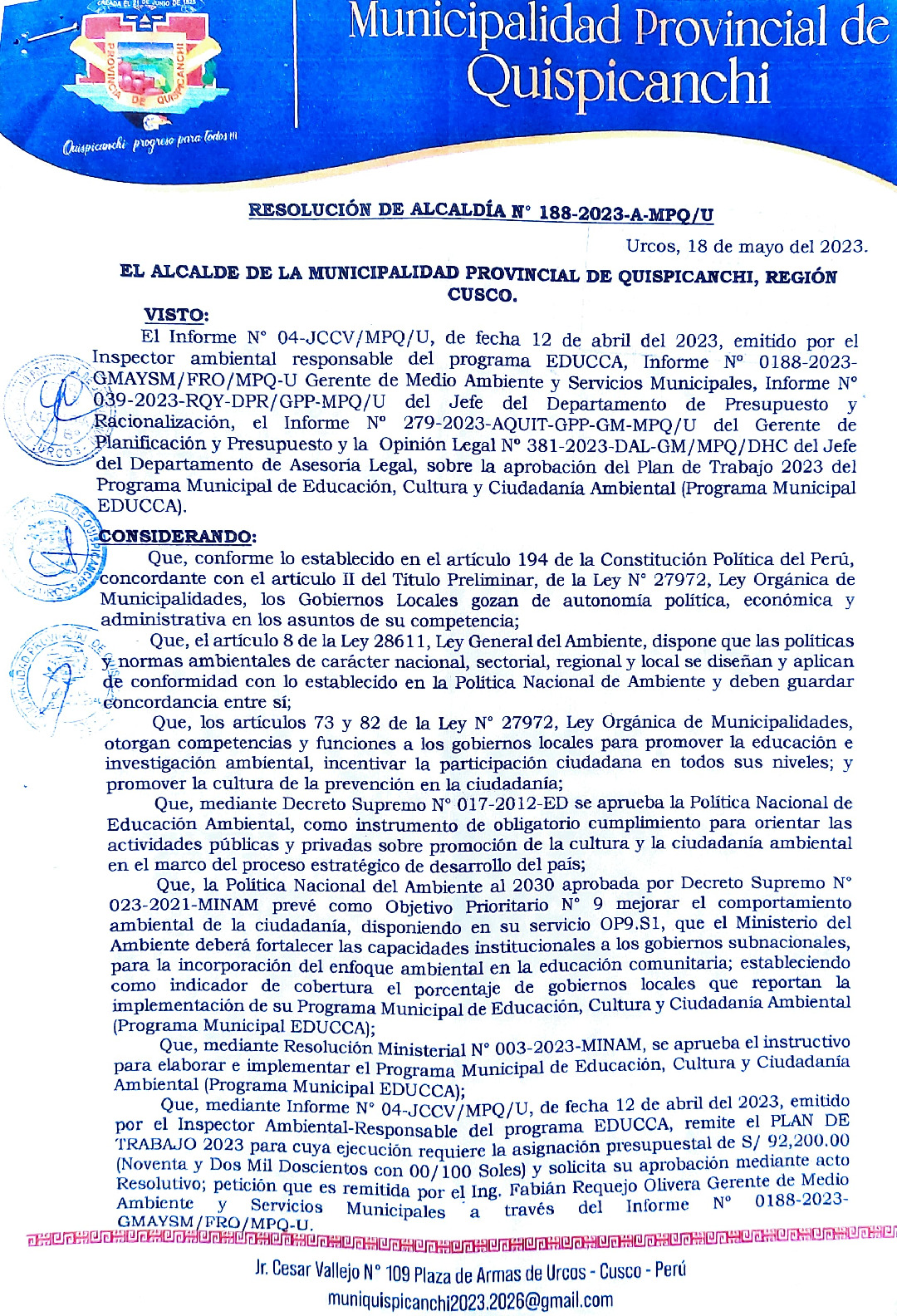 La presente Resolución de Alcaldía aprueba el Plan de Trabajo 2023 del Programa Municipal de Educación, Cultura y Ciudadanía Ambiental de la Municipalidad Provincial de Quispicanchi (Cusco), con la finalidad de definir las actividades de educación, cultura y ciudadanía ambiental que se desarrollaran en la localidad durante el presente año.