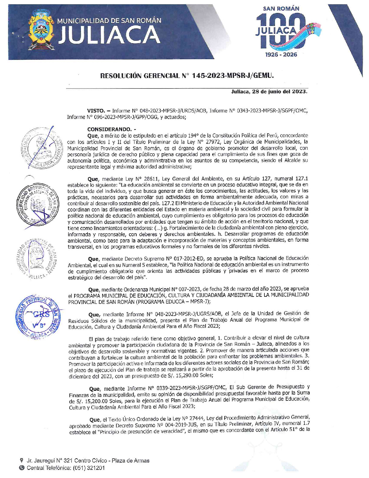 La presente Resolución de Gerencia Municipal aprueba el Plan de Trabajo 2023 del Programa Municipal de Educación, Cultura y Ciudadanía Ambiental de la Municipalidad Provincial de San Román (Puno), con la finalidad de definir las actividades de educación, cultura y ciudadanía ambiental que se desarrollaran en la localidad durante el presente año.