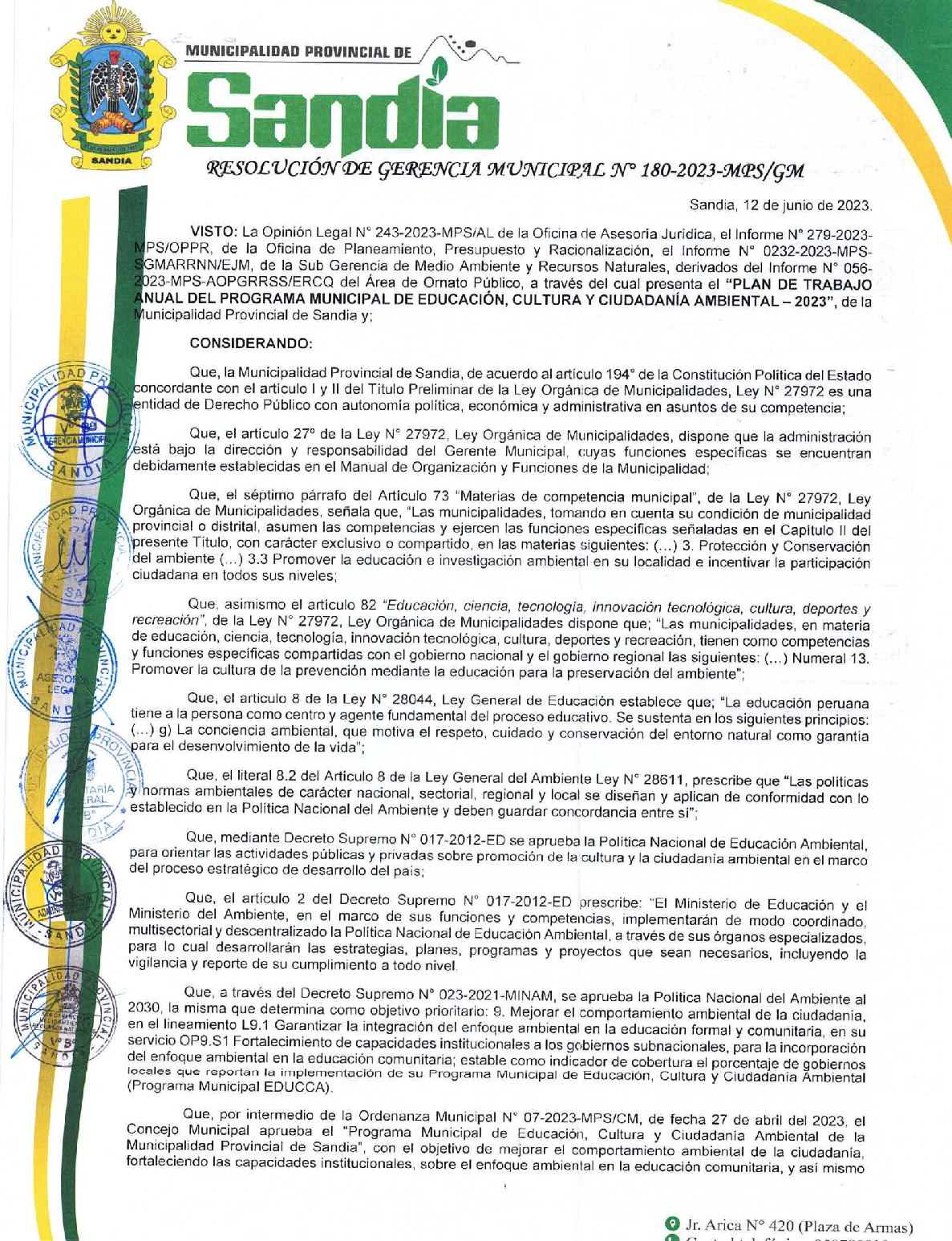 La presente Resolución de Gerencia Municipal aprueba el Plan de Trabajo 2023 del Programa Municipal de Educación, Cultura y Ciudadanía Ambiental de la Municipalidad Provincial de Sandia (Puno), con la finalidad de definir las actividades de educación, cultura y ciudadanía ambiental que se desarrollaran en la localidad durante el presente año.