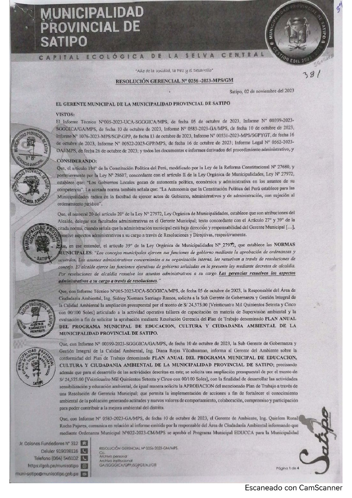 La presente Resolución de Gerencia Municipal aprueba el Plan de Trabajo 2023 del Programa Municipal de Educación, Cultura y Ciudadanía Ambiental de la Municipalidad Provincial de Satipo (Junín), con la finalidad de definir las actividades de educación, cultura y ciudadanía ambiental que se desarrollaran en la localidad durante el presente año.