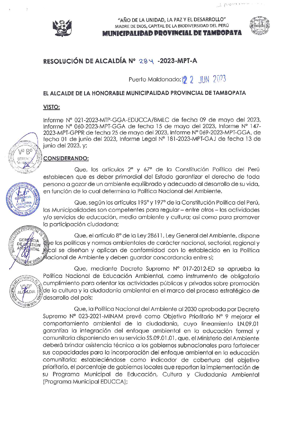 La presente Resolución de Alcaldía aprueba el Plan de Trabajo 2023 del Programa Municipal de Educación, Cultura y Ciudadanía Ambiental de la Municipalidad Provincial de Tambopata (Madre de Dios), con la finalidad de definir las actividades de educación, cultura y ciudadanía ambiental que se desarrollaran en la localidad durante el presente año.