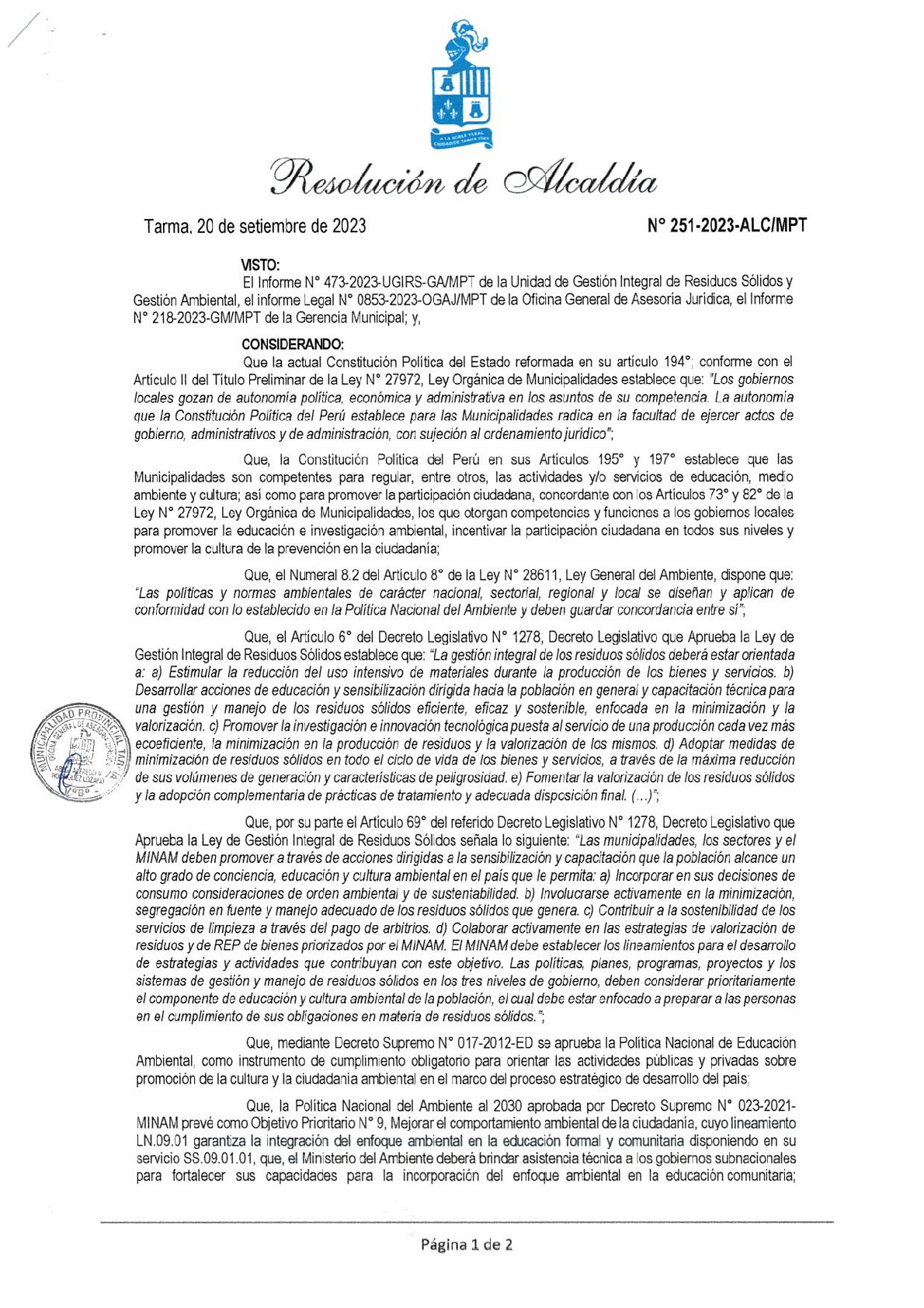 La presente Resolución de Alcaldía aprueba el Plan de Trabajo 2023 del Programa Municipal de Educación, Cultura y Ciudadanía Ambiental de la Municipalidad Provincial de Tarma (Junín), con la finalidad de definir las actividades de educación, cultura y ciudadanía ambiental que se desarrollaran en la localidad durante el presente año.