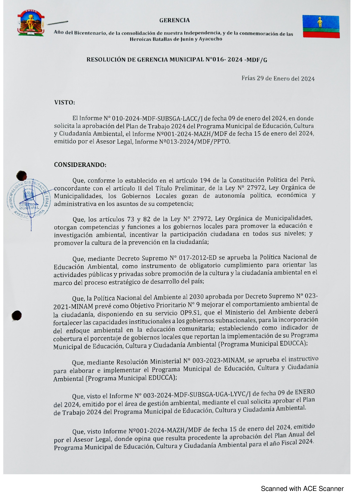 La presente Resolución de Gerencia Municipal aprueba el Plan de Trabajo 2024 del Programa Municipal de Educación, Cultura y Ciudadanía Ambiental de la Municipalidad Distrital de Frías - Ayabaca (Piura), con la finalidad de definir las actividades de educación, cultura y ciudadanía ambiental que se desarrollaran en la localidad durante el presente año.