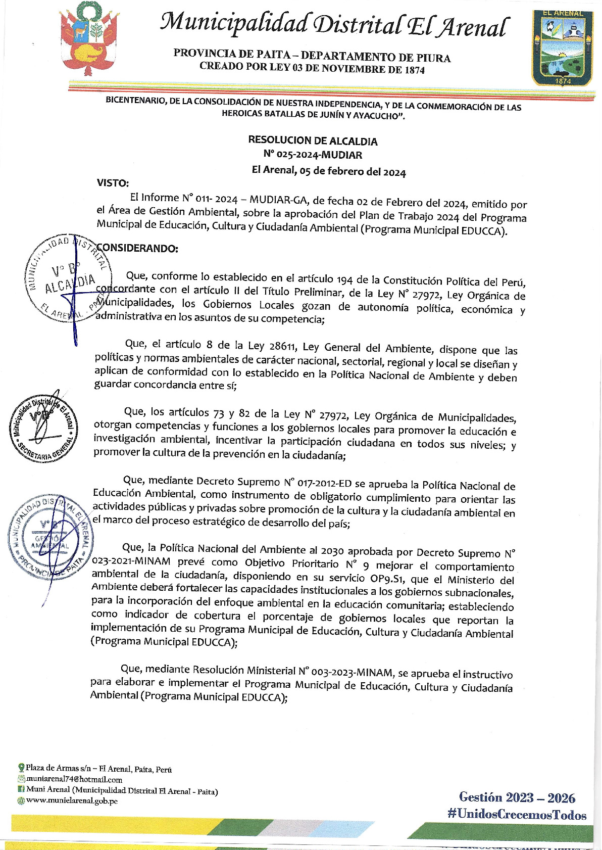 La presente Resolución de Gerencia Municipal aprueba el Plan de Trabajo 2024 del Programa Municipal de Educación, Cultura y Ciudadanía Ambiental de la Municipalidad Distrital de El Arenal - Paita (Piura), con la finalidad de definir las actividades de educación, cultura y ciudadanía ambiental que se desarrollaran en la localidad durante el presente año.
