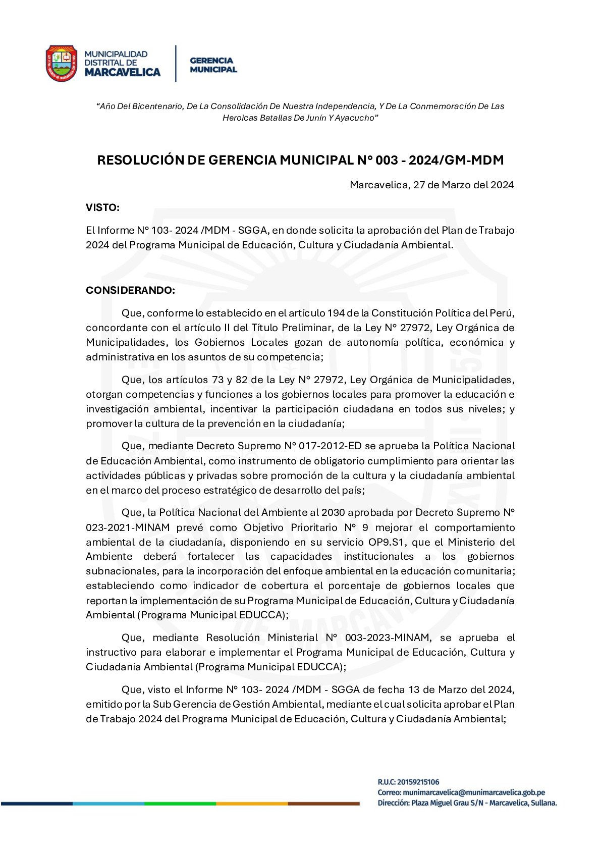 La presente Resolución de Gerencia Municipal aprueba el Plan de Trabajo 2024 del Programa Municipal de Educación, Cultura y Ciudadanía Ambiental de la Municipalidad Distrital de Marcavelica - Sullana (Piura), con la finalidad de definir las actividades de educación, cultura y ciudadanía ambiental que se desarrollaran en la localidad durante el presente año.