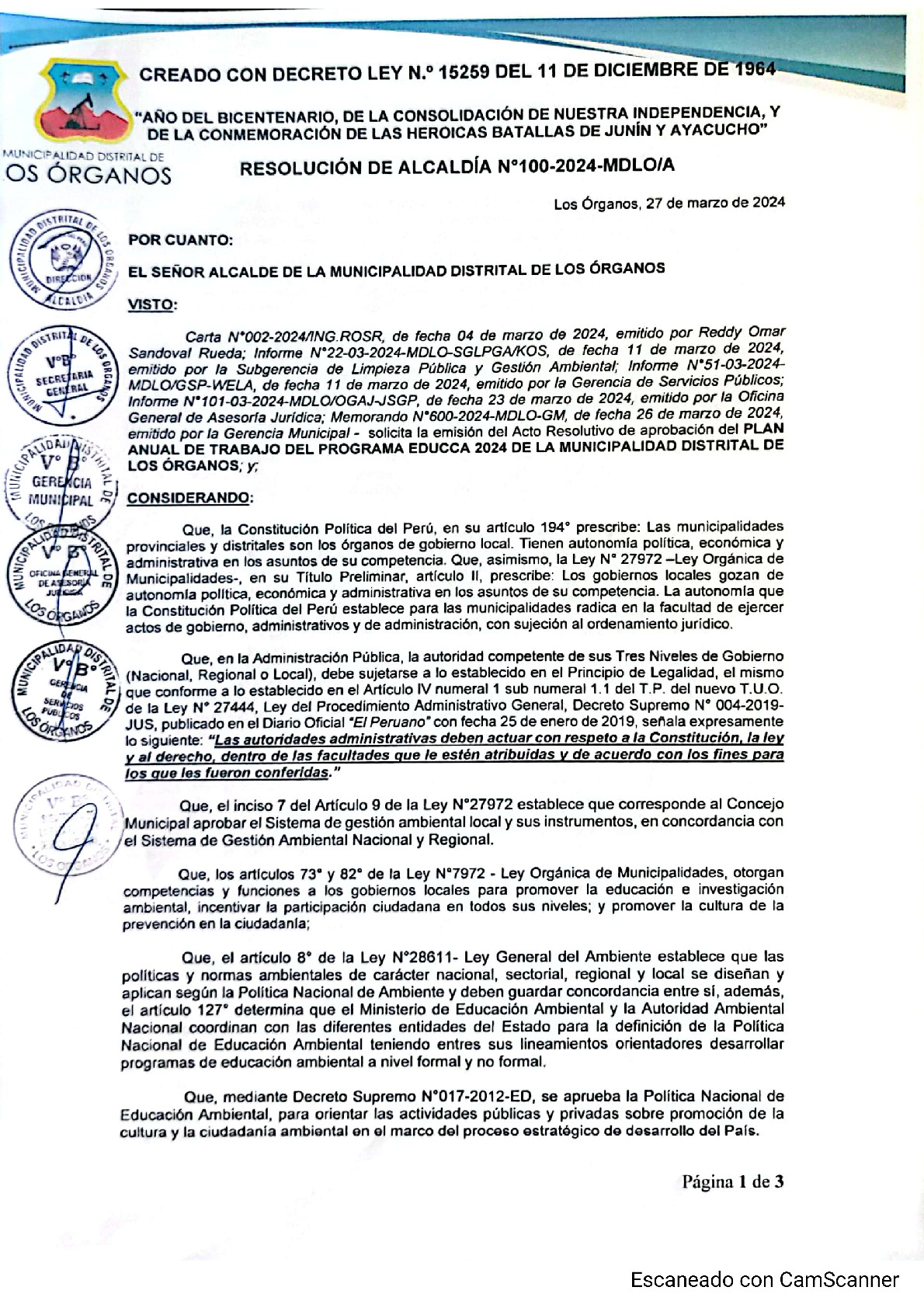La presente Resolución de aprueba el Plan de Trabajo 2024 del Programa Municipal de Educación, Cultura y Ciudadanía Ambiental de la Municipalidad Distrital de Los Órganos - Talara (Piura), con la finalidad de definir las actividades de educación, cultura y ciudadanía ambiental que se desarrollaran en la localidad durante el presente año.