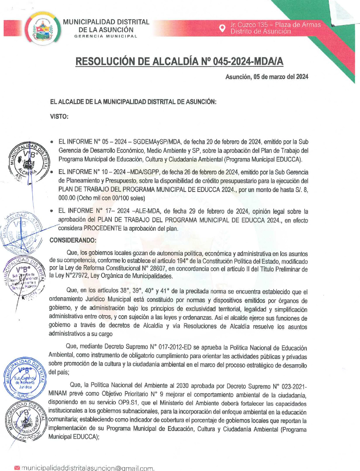 La presente Resolución de Alcaldía aprueba el Plan de Trabajo 2024 del Programa Municipal de Educación, Cultura y Ciudadanía Ambiental de la Municipalidad Distrital de Asunción - Cajamarca (Cajamarca), con la finalidad de definir las actividades de educación, cultura y ciudadanía ambiental que se desarrollaran en la localidad durante el presente año.