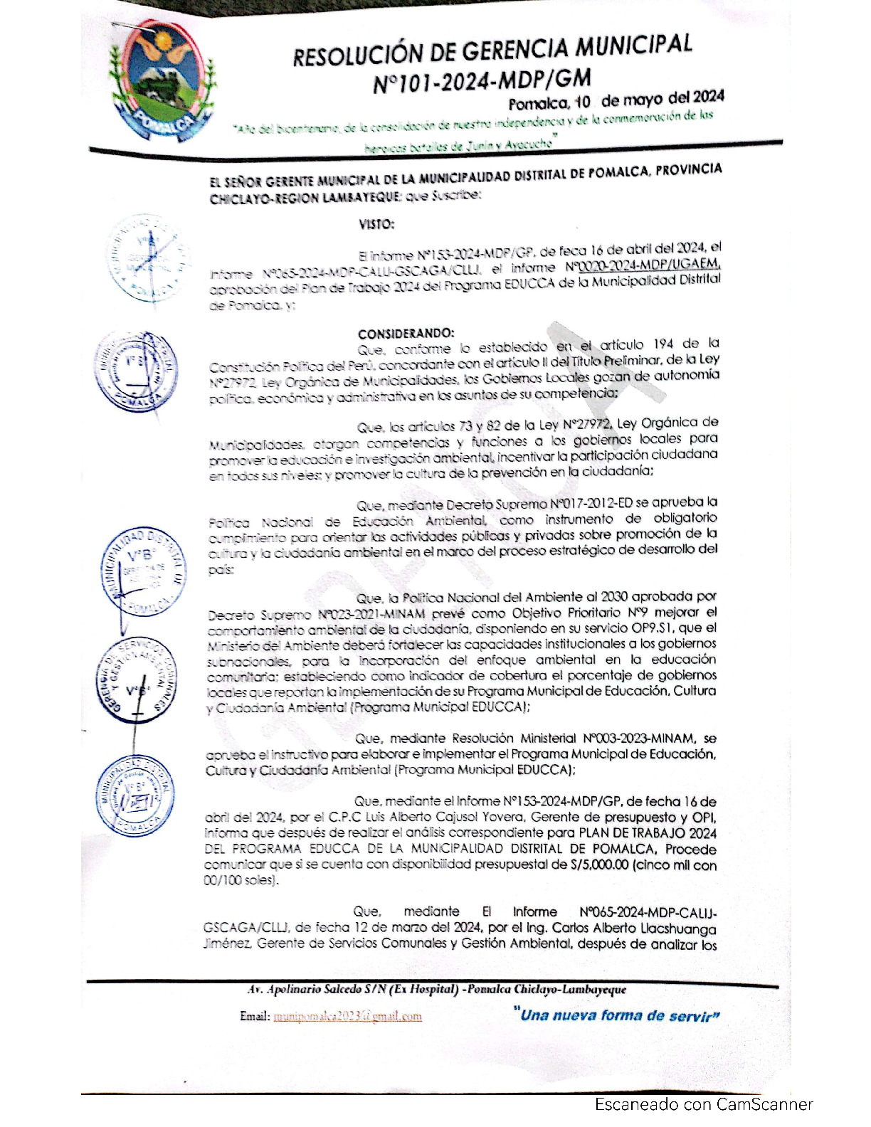 La presente Resolución de Gerencia Municipal aprueba el Plan de Trabajo 2024 del Programa Municipal de Educación, Cultura y Ciudadanía Ambiental de la Municipalidad Distrital de Pomalca - Chiclayo (Lambayeque), con la finalidad de definir las actividades de educación, cultura y ciudadanía ambiental que se desarrollaran en la localidad durante el presente año.