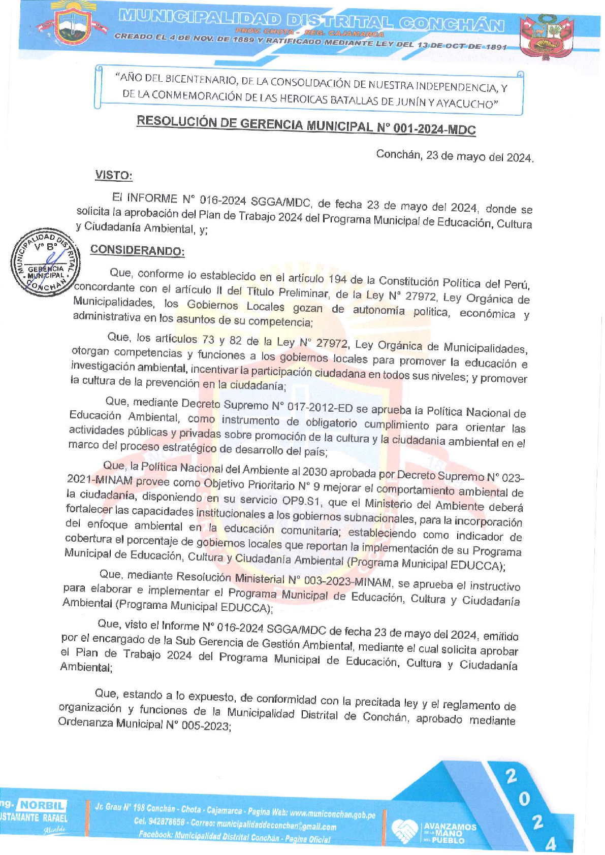 La presente Resolución de Gerencia Municipal aprueba el Plan de Trabajo 2024 del Programa de Educación, Cultura y Ciudadanía Ambiental de la Municipalidad Distrital de Conchán - Chota (Cajamarca), con la finalidad de definir las actividades de educación, cultura y ciudadanía ambiental que se desarrollaran en la localidad durante el presente año.