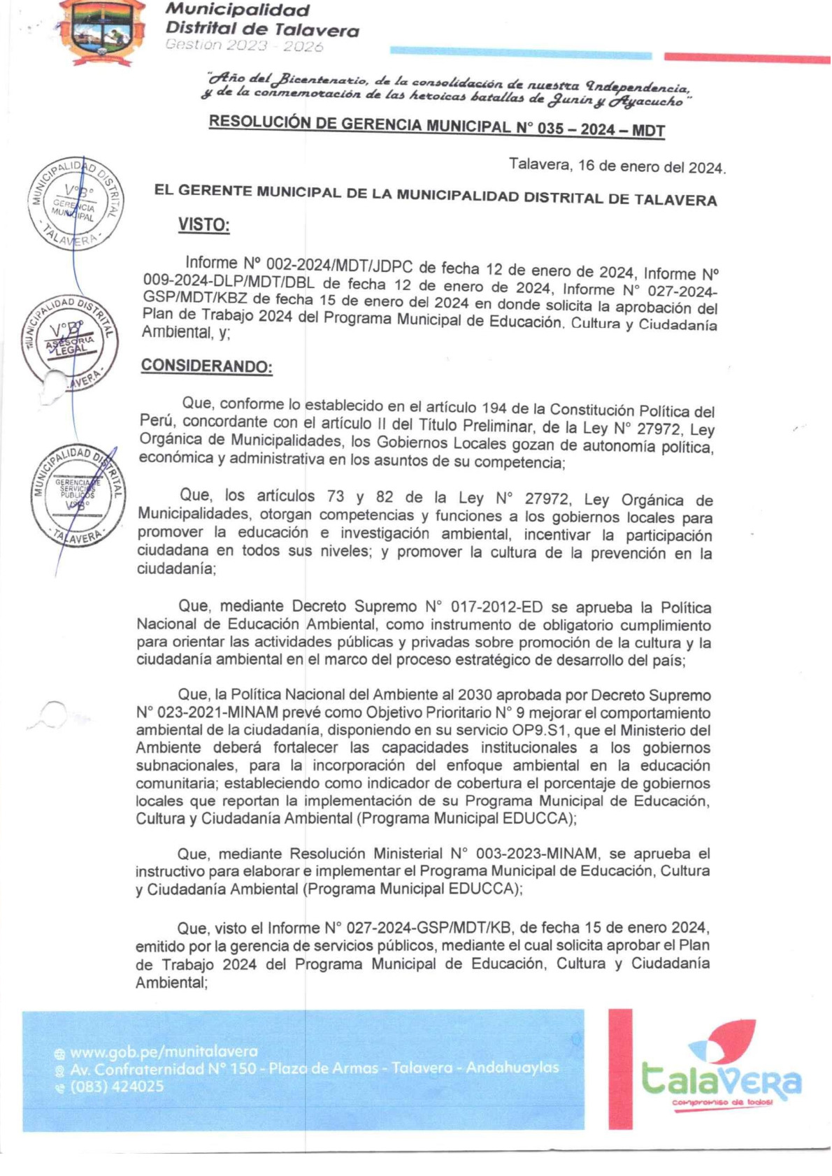 La presente Resolución de Gerencia Municipal aprueba el Plan de Trabajo 2024 del Programa Municipal de Educación, Cultura y Ciudadanía Ambiental de la Municipalidad Distrital de Talavera - Andahuaylas (Apurímac), con la finalidad de definir las actividades de educación, cultura y ciudadanía ambiental que se desarrollaran en la localidad durante el presente año.