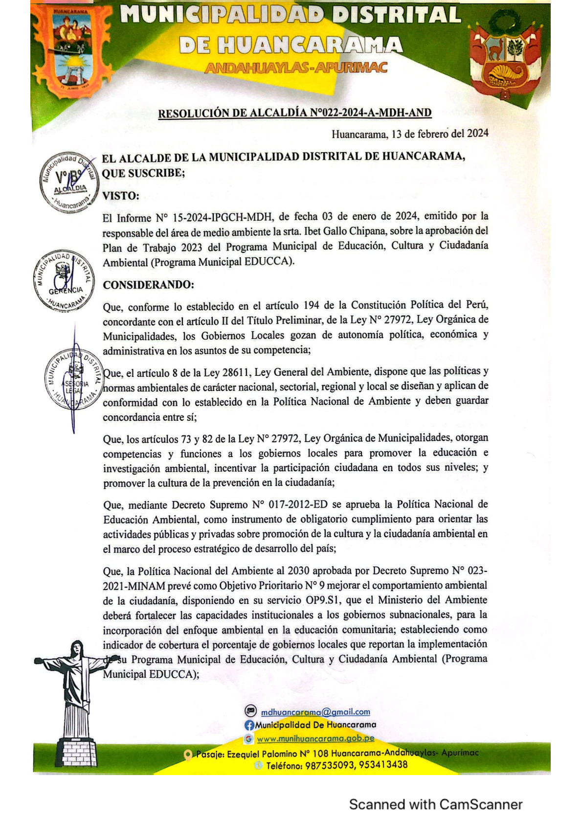 La presente Resolución de Gerencia Municipal aprueba el Plan de Trabajo 2024 del Programa Municipal de Educación, Cultura y Ciudadanía Ambiental de la Municipalidad Distrital de Huancarama - Andahuaylas (Apurímac), con la finalidad de definir las actividades de educación, cultura y ciudadanía ambiental que se desarrollaran en la localidad durante el presente año.