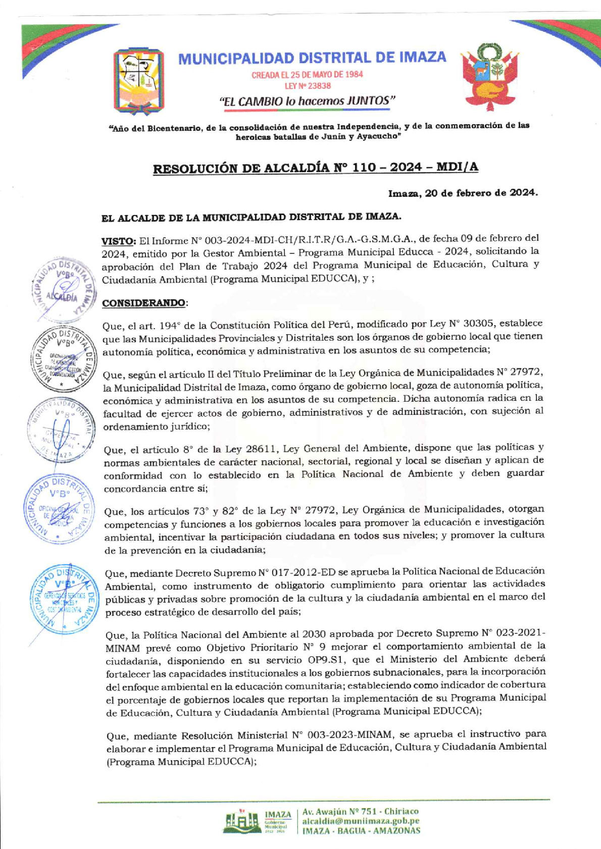 La presente Resolución de Alcaldía aprueba el Plan de Trabajo 2024 del Programa Municipal de Educación, Cultura y Ciudadanía Ambiental de la Municipalidad Distrital de Imaza - Bagua (Amazonas), con la finalidad de definir las actividades de educación, cultura y ciudadanía ambiental que se desarrollaran en la localidad durante el presente año.