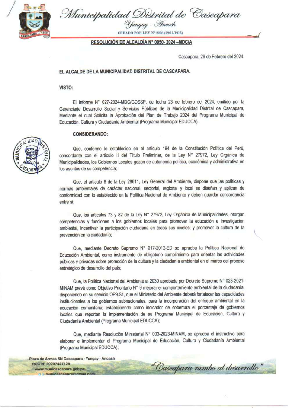 La presente Resolución de Alcaldía aprueba el Plan de Trabajo 2024 del Programa Municipal de Educación, Cultura y Ciudadanía Ambiental de la Municipalidad Distrital de Cascapara - Yungay (Áncash), con la finalidad de definir las actividades de educación, cultura y ciudadanía ambiental que se desarrollaran en la localidad durante el presente año.