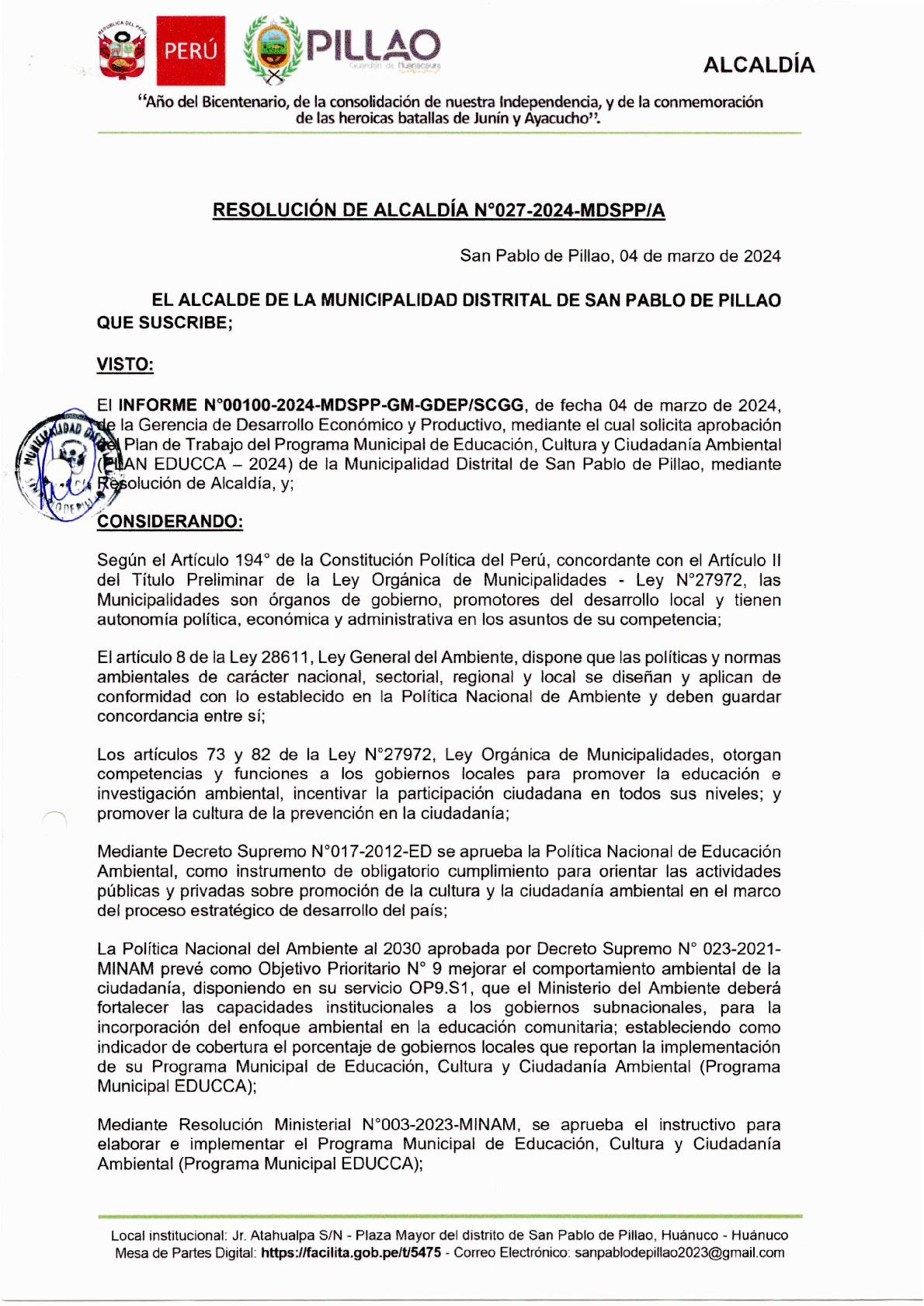 La presente Resolución de Alcaldía aprueba el Plan de Trabajo 2024 del Programa de Educación, Cultura y Ciudadanía Ambiental de la Municipalidad Distrital de San Pablo de Pillao - Huánuco (Huánuco), con la finalidad de definir las actividades de educación, cultura y ciudadanía ambiental que se desarrollaran en la localidad durante el presente año.