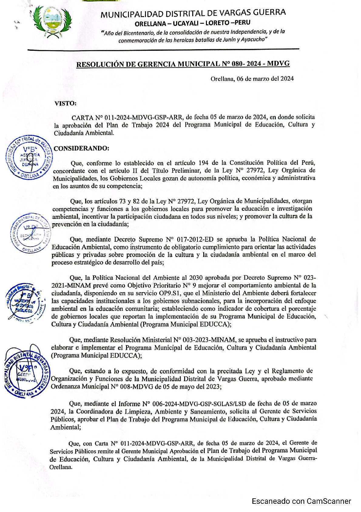 La presente Resolución de Gerencia Municipal aprueba el Plan de Trabajo 2024 del Programa Municipal de Educación, Cultura y Ciudadanía Ambiental de la Municipalidad Distrital de Vargas Guerra - Ucayali (Loreto), con la finalidad de definir las actividades de educación, cultura y ciudadanía ambiental que se desarrollaran en la localidad durante el presente año.