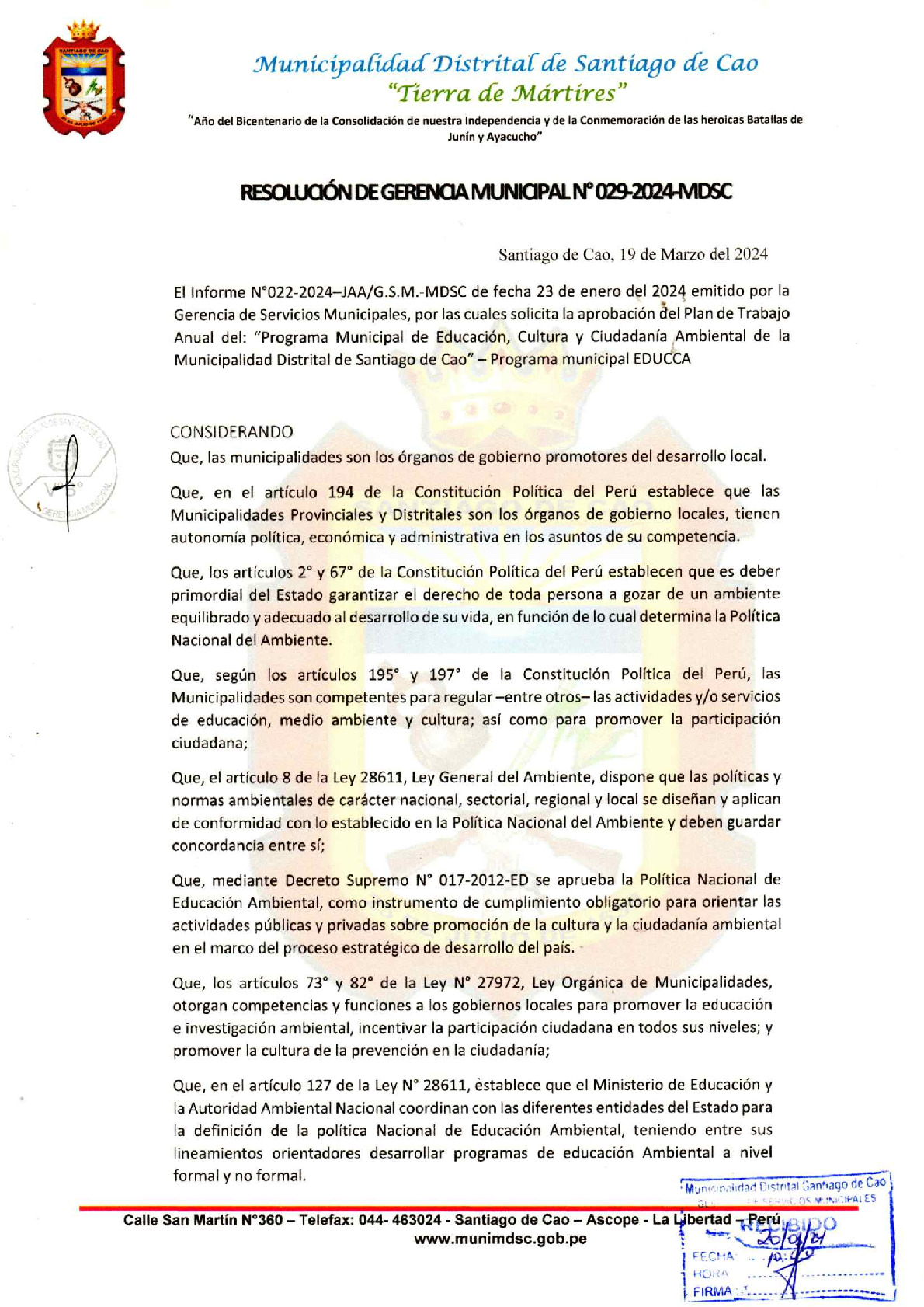 La presente Resolución de Gerencia Municipal aprueba el Plan de Trabajo 2024 del Programa Municipal de Educación, Cultura y Ciudadanía Ambiental de la Municipalidad Distrital de Santiago de Cao - Ascope (La Libertad), con la finalidad de definir las actividades de educación, cultura y ciudadanía ambiental que se desarrollaran en la localidad durante el presente año.
