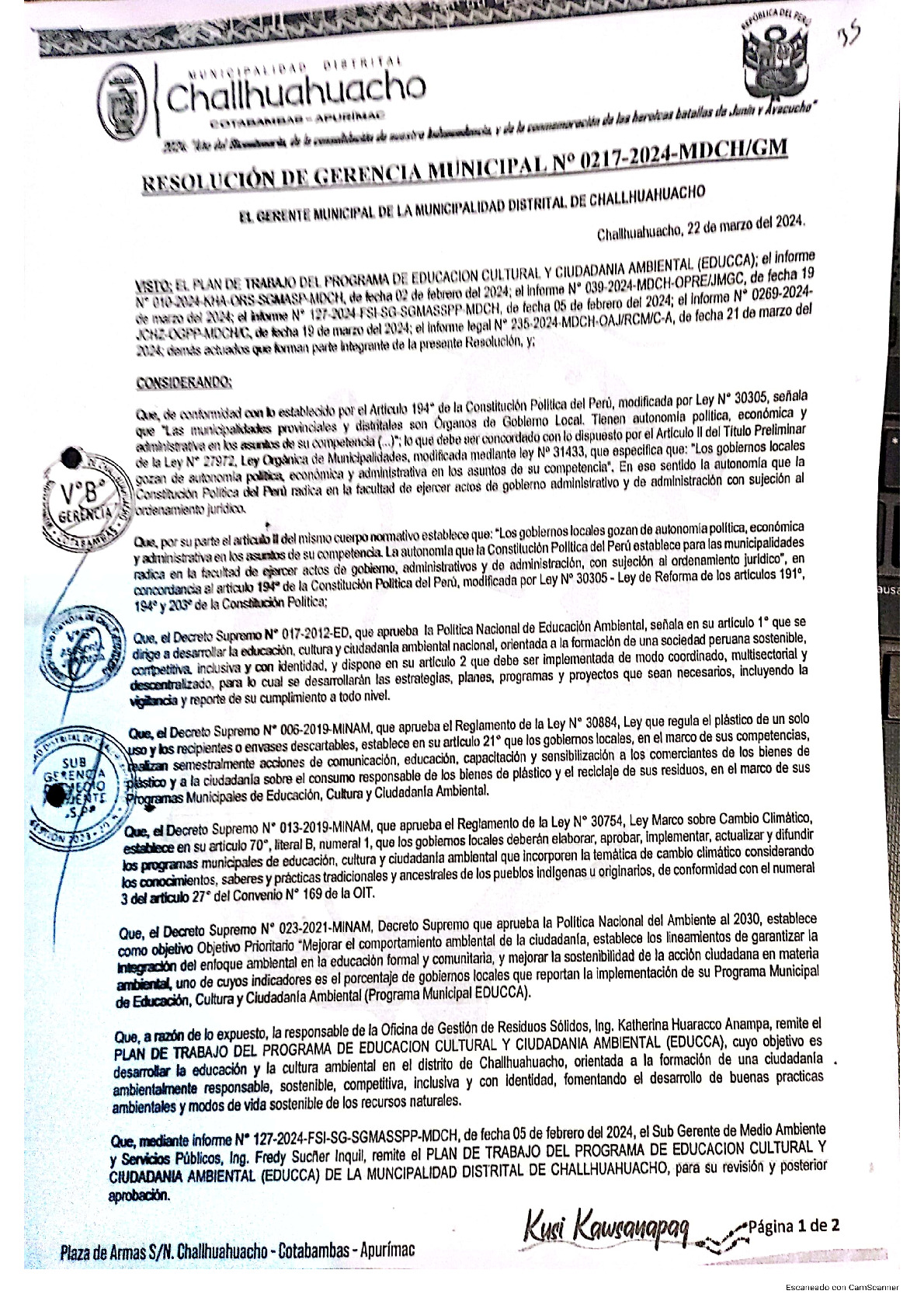 La presente Resolución de Gerencia Municipal aprueba el Plan de Trabajo 2024 del Programa de Educación, Cultura y Ciudadanía Ambiental de la Municipalidad Distrital de Challhuahuacho - Cotabambas (Apurímac), con la finalidad de definir las actividades de educación, cultura y ciudadanía ambiental que se desarrollaran en la localidad durante el presente año.