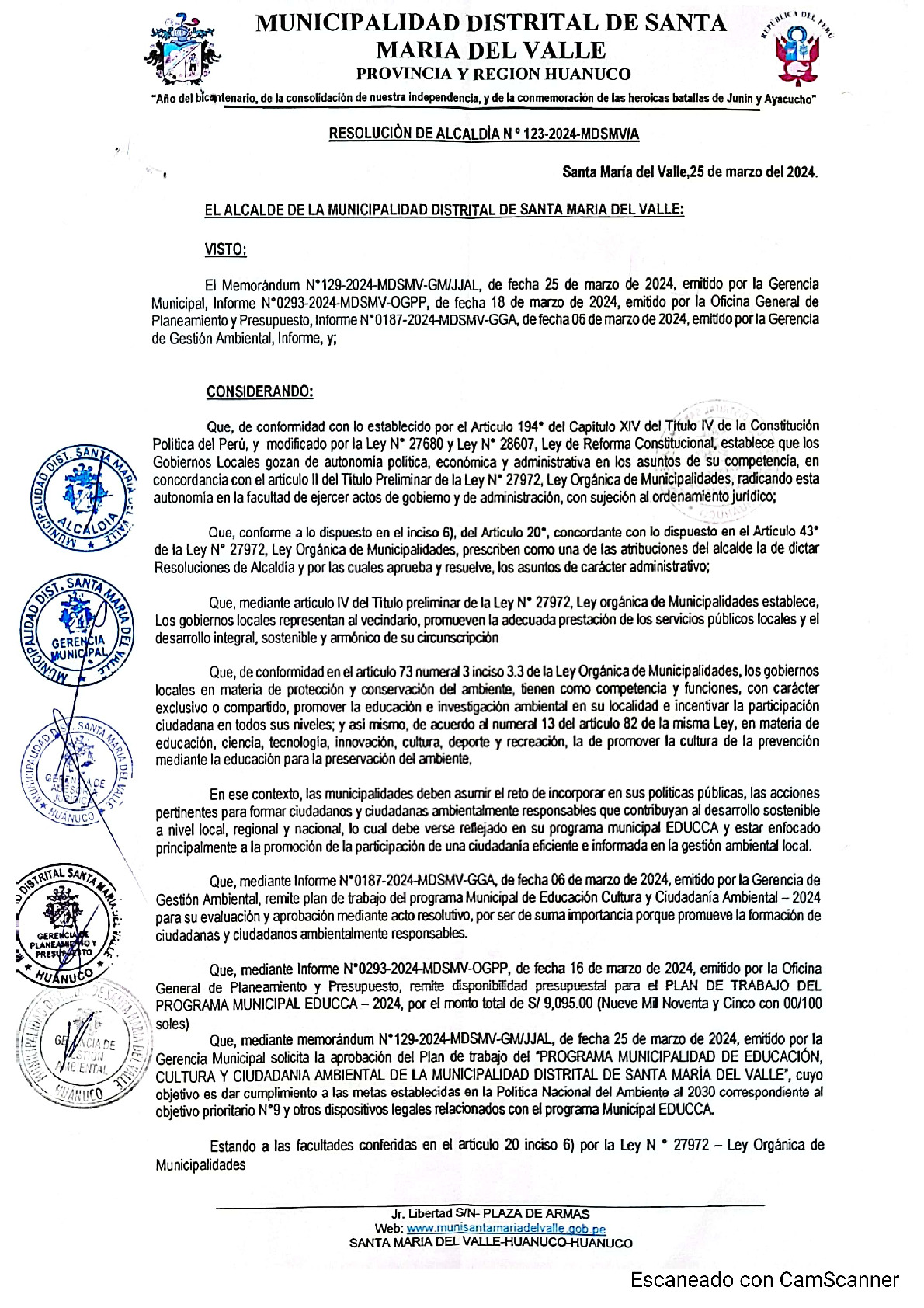 La presente Resolución de Alcaldía aprueba el Plan de Trabajo 2024 del Programa de Educación, Cultura y Ciudadanía Ambiental de la Municipalidad Distrital de Santa María del Valle - Huánuco (Huánuco), con la finalidad de definir las actividades de educación, cultura y ciudadanía ambiental que se desarrollaran en la localidad durante el presente año.