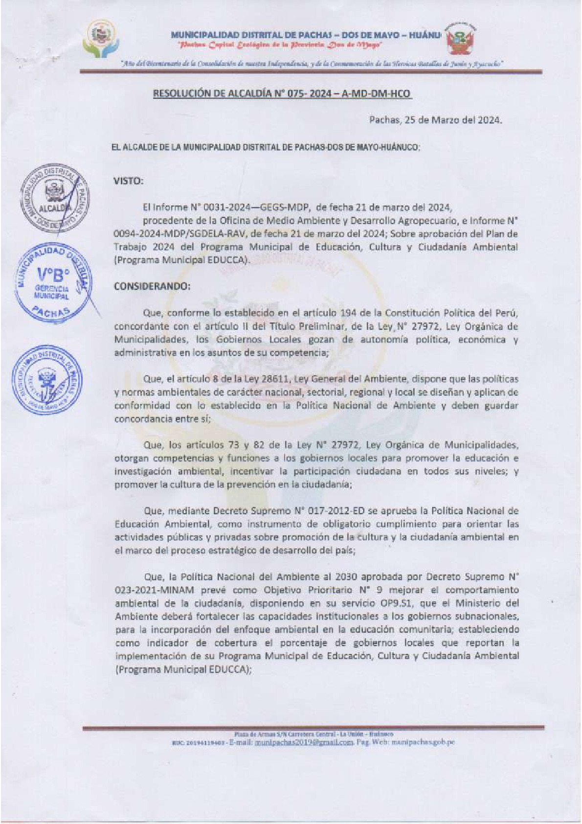 La presente Resolución de Alcaldía aprueba el Plan de Trabajo 2024 del Programa de Educación, Cultura y Ciudadanía Ambiental de la Municipalidad Distrital de Pachas - Dos de Mayo (Huánuco), con la finalidad de definir las actividades de educación, cultura y ciudadanía ambiental que se desarrollaran en la localidad durante el presente año.