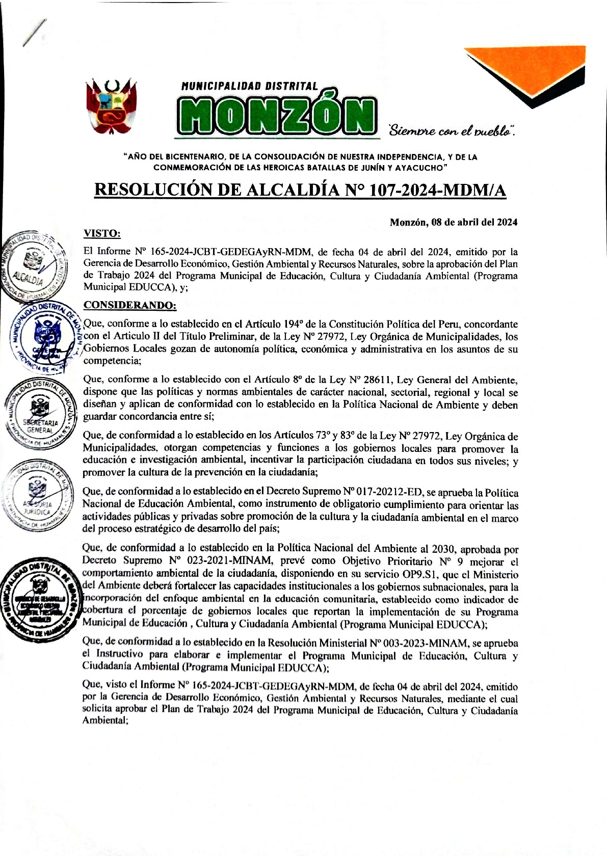 La presente Resolución de Alcaldía aprueba el Plan de Trabajo 2024 del Programa Municipal de Educación, Cultura y Ciudadanía Ambiental de la Municipalidad Distrital de Monzón - Huamalies (Huánuco), con la finalidad de definir las actividades de educación, cultura y ciudadanía ambiental que se desarrollaran en la localidad durante el presente año.