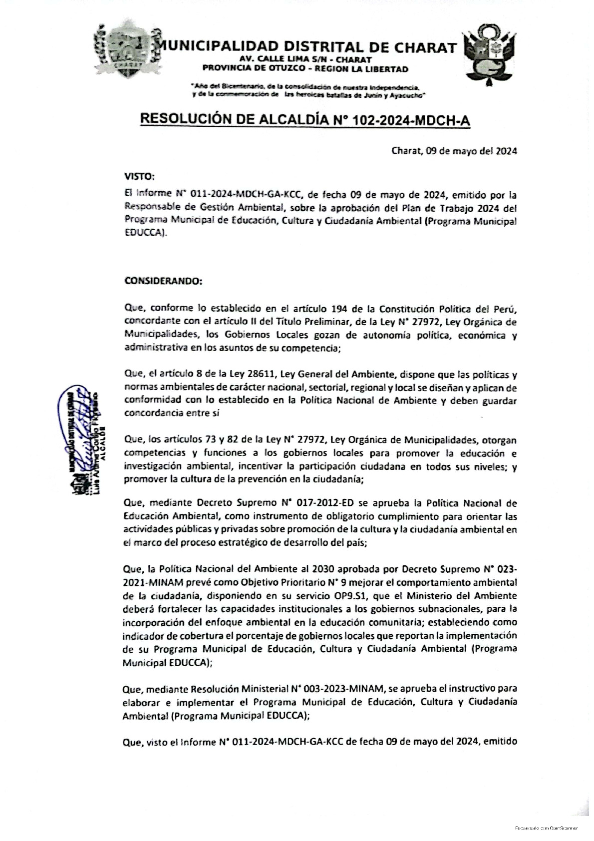La presente Resolución de Alcaldía aprueba el Plan de Trabajo 2024 del Programa Municipal de Educación, Cultura y Ciudadanía Ambiental de la Municipalidad Distrital de Charat - Otuzco (La Libertad), con la finalidad de definir las actividades de educación, cultura y ciudadanía ambiental que se desarrollaran en la localidad durante el presente año.