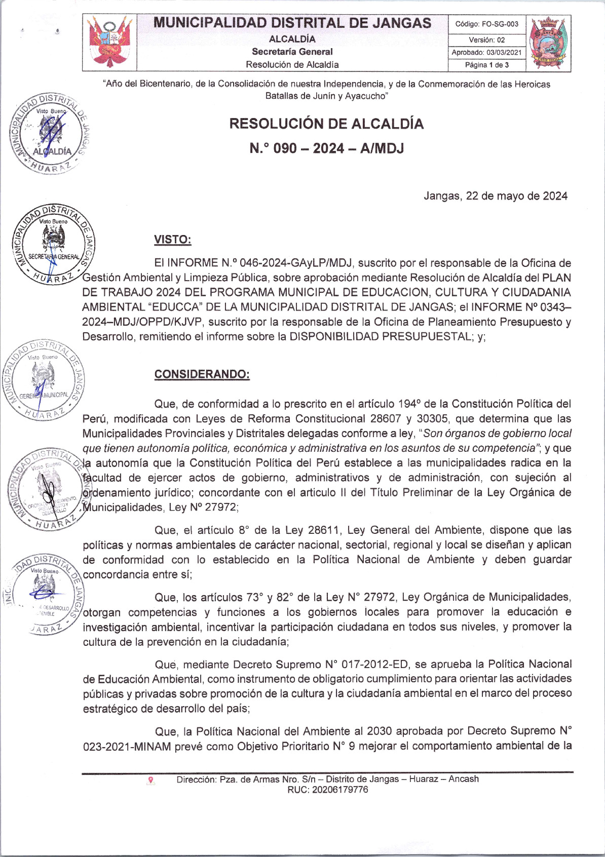 La presente Resolución de Alcaldía aprueba el Plan de Trabajo 2024 del Programa Municipal de Educación, Cultura y Ciudadanía Ambiental de la Municipalidad Distrital de Jangas - Huaraz (Áncash), con la finalidad de definir las actividades de educación, cultura y ciudadanía ambiental que se desarrollaran en la localidad durante el presente año.