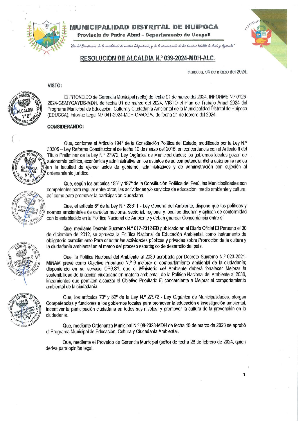 La presente Resolución de Alcaldía aprueba el Plan de Trabajo 2024 del Programa de Educación, Cultura y Ciudadanía Ambiental de la Municipalidad Distrital de Huipoca - Padre Abad (Ucayali), con la finalidad de definir las actividades de educación, cultura y ciudadanía ambiental que se desarrollaran en la localidad durante el presente año.