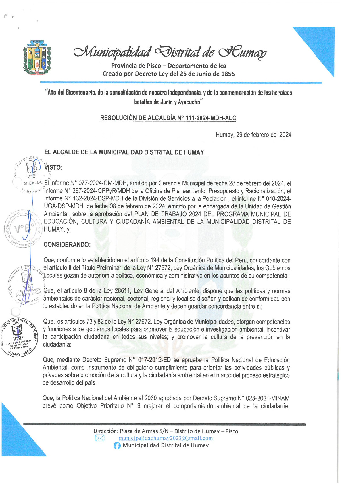 La presente Resolución de Alcaldía aprueba el Plan de Trabajo 2024 del Programa Municipal de Educación, Cultura y Ciudadanía Ambiental de la Municipalidad Distrital de Humay - Pisco (Ica), con la finalidad de definir las actividades de educación, cultura y ciudadanía ambiental que se desarrollaran en la localidad durante el presente año.