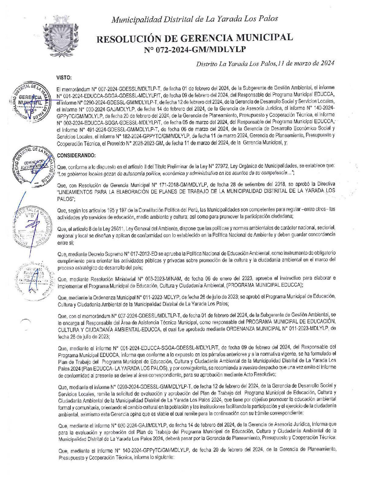 La presente Resolución de Gerencia Municipal aprueba el Plan de Trabajo 2024 del Programa de Educación, Cultura y Ciudadanía Ambiental de la Municipalidad Distrital de La Yarada Los Palos - Tacna(Tacna), con la finalidad de definir las actividades de educación, cultura y ciudadanía ambiental que se desarrollaran en la localidad durante el presente año.
