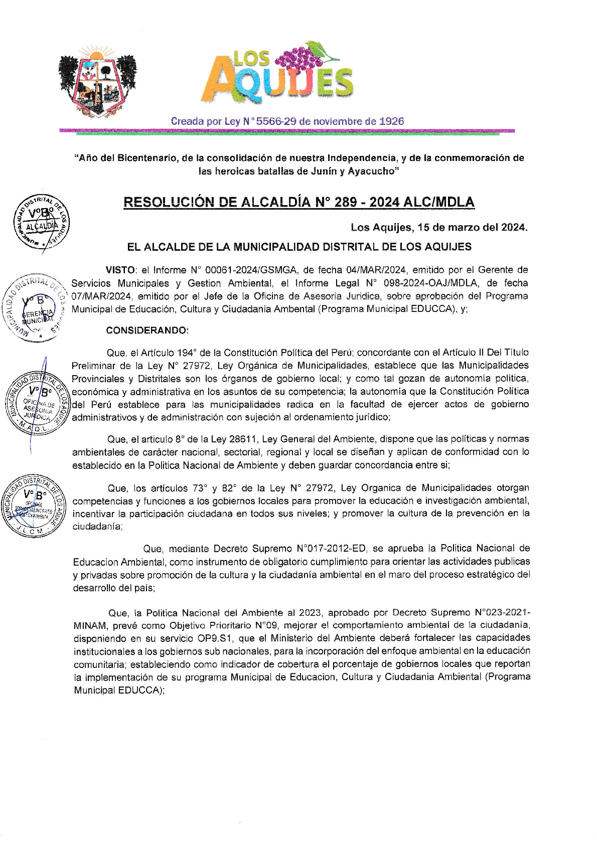 La presente Resolución de Alcaldía aprueba el Plan de Trabajo 2024 del Programa Municipal de Educación, Cultura y Ciudadanía Ambiental de la Municipalidad Distrital de Los Aquijes - Ica (Ica), con la finalidad de definir las actividades de educación, cultura y ciudadanía ambiental que se desarrollaran en la localidad durante el presente año.