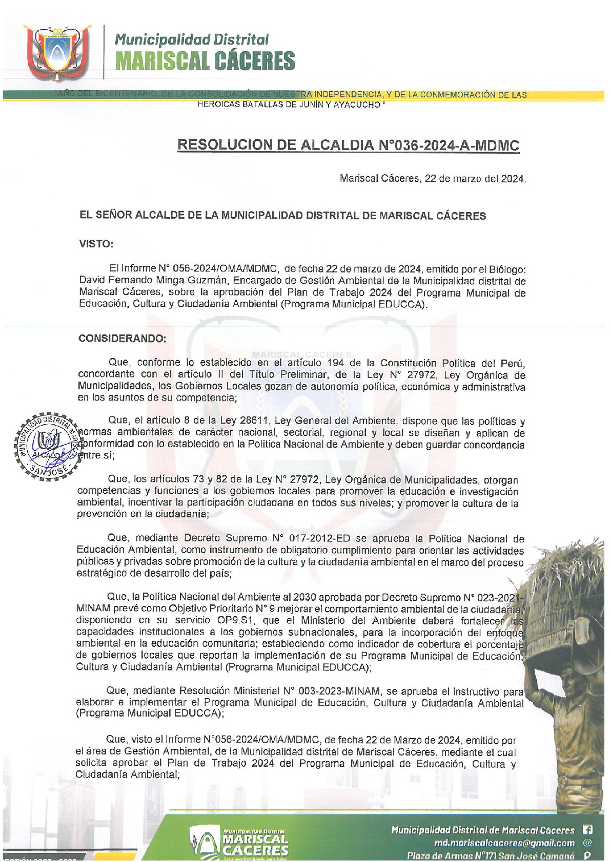 La presente Resolución de Alcaldía aprueba el Plan de Trabajo 2024 del Programa de Educación, Cultura y Ciudadanía Ambiental de la Municipalidad Distrital de Mariscal Cáceres - Camaná (Arequipa), con la finalidad de definir las actividades de educación, cultura y ciudadanía ambiental que se desarrollaran en la localidad durante el presente año.