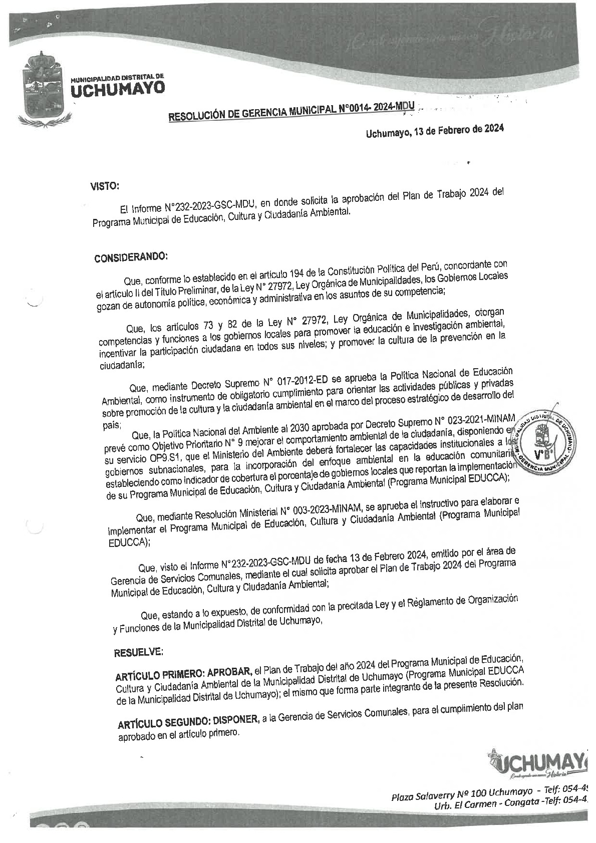 La presente Resolución de Gerencia Municipal aprueba el Plan de Trabajo 2024 del Programa Municipal de Educación, Cultura y Ciudadanía Ambiental de la Municipalidad Distrital de Uchumayo - Arequipa (Arequipa), con la finalidad de definir las actividades de educación, cultura y ciudadanía ambiental que se desarrollaran en la localidad durante el presente año.