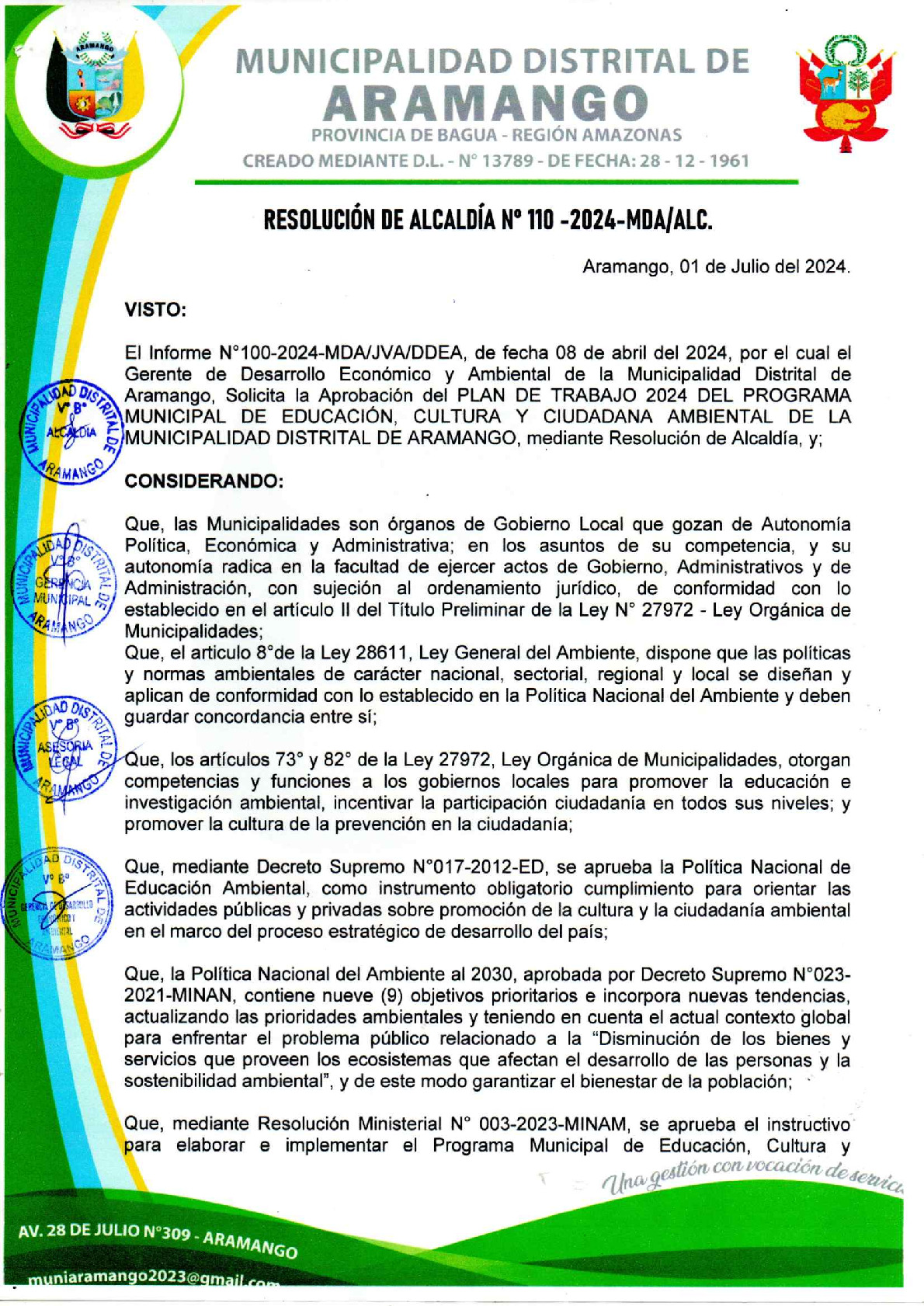La presente Resolución de Alcaldía aprueba el Plan de Trabajo 2024 del Programa Municipal de Educación, Cultura y Ciudadanía Ambiental de la Municipalidad Distrital de Aramango -Bagua (Amazonas), con la finalidad de definir las actividades de educación, cultura y ciudadanía ambiental que se desarrollaran en la localidad durante el presente año.