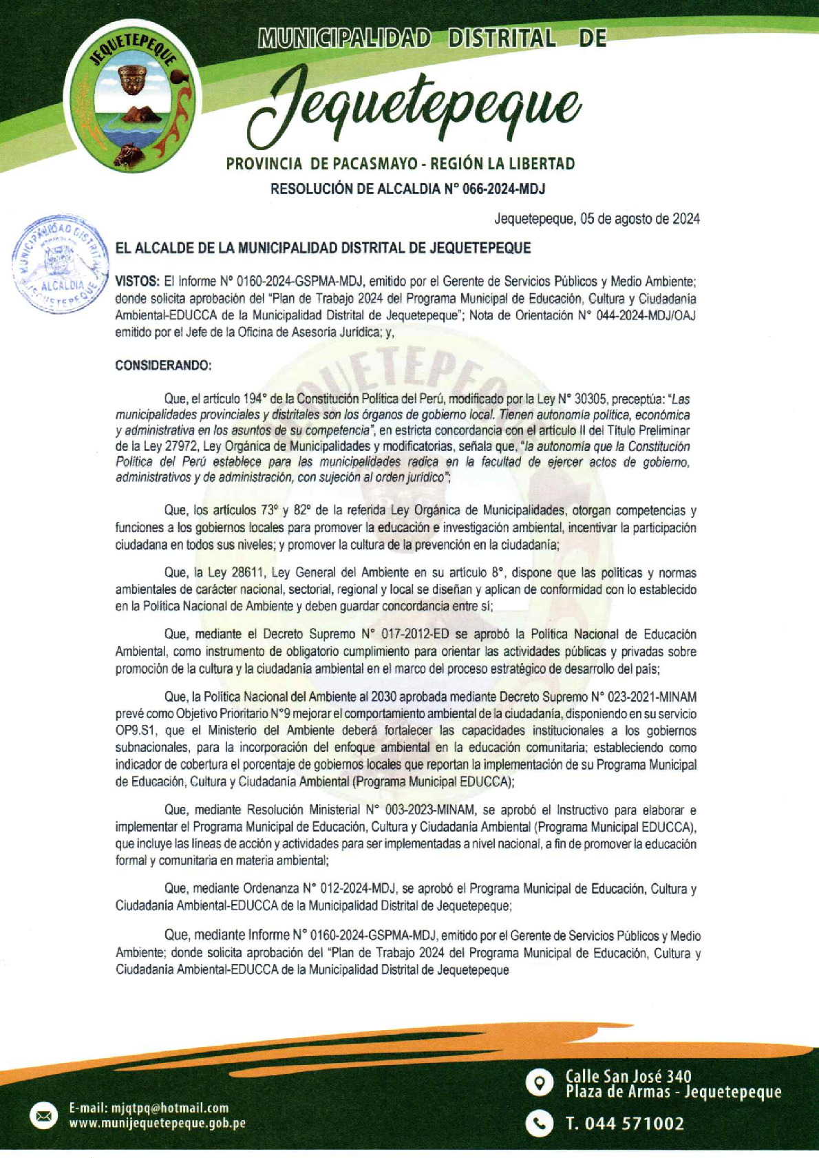 La presente Resolución de Alcaldía aprueba el Plan de Trabajo 2024 del Programa Municipal de Educación, Cultura y Ciudadanía Ambiental de la Municipalidad Distrital de Jequetepeque - Pacasmayo (La Libertad), con la finalidad de definir las actividades de educación, cultura y ciudadanía ambiental que se desarrollaran en la localidad durante el presente año.