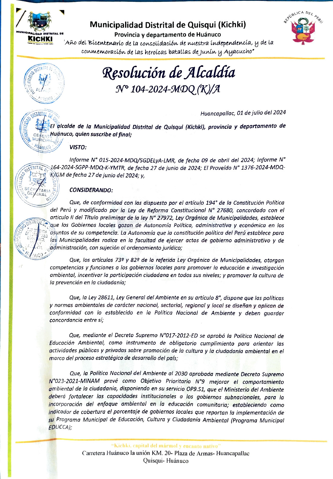 La presente Resolución de Alcaldía aprueba el Plan de Trabajo 2024 del Programa Municipal de Educación, Cultura y Ciudadanía Ambiental de la Municipalidad Distrital de Quisqui - Huánuco (Huánuco), con la finalidad de definir las actividades de educación, cultura y ciudadanía ambiental que se desarrollaran en la localidad durante el presente año.