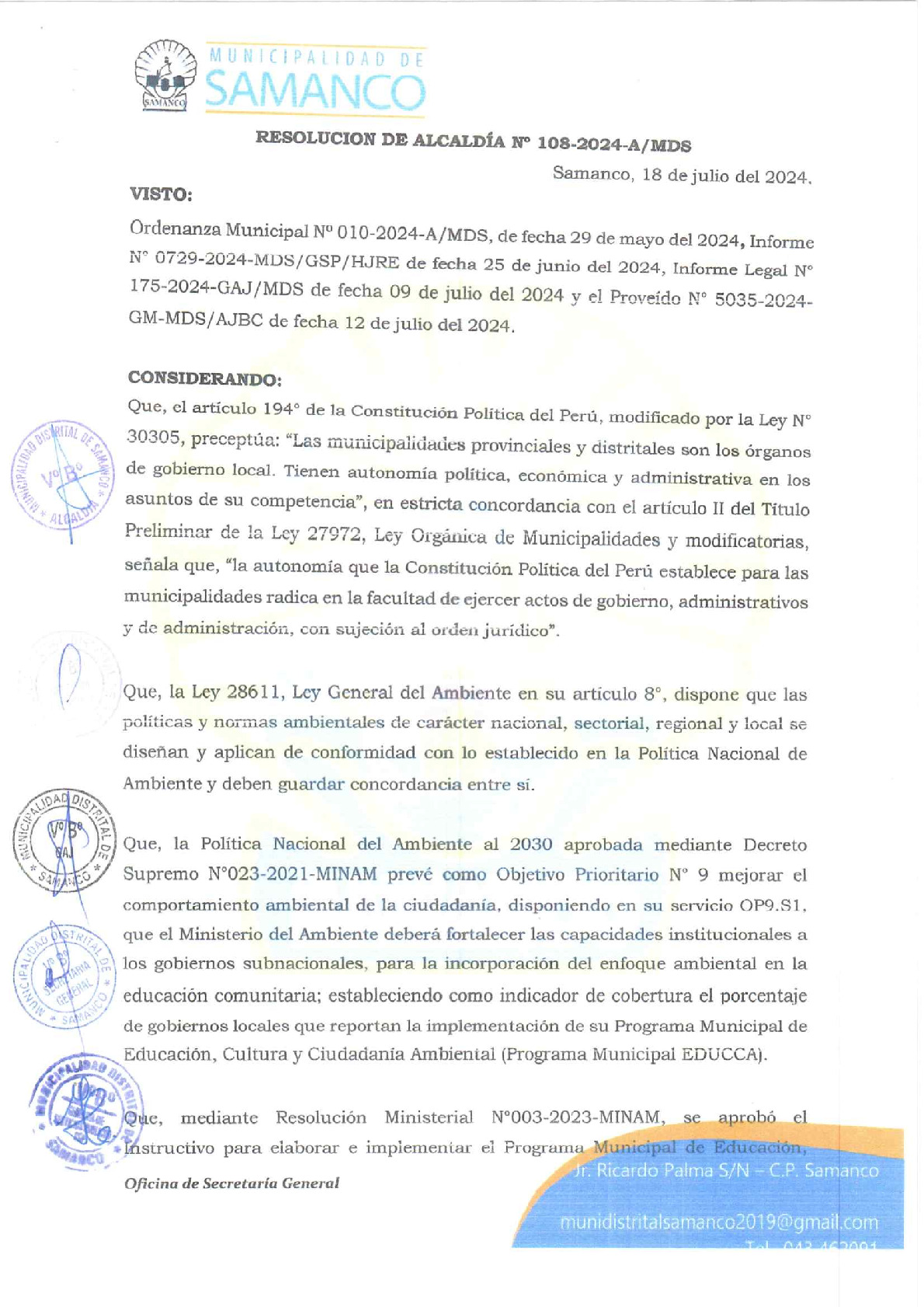 La presente Resolución de Alcaldía aprueba el Plan de Trabajo 2024 del Programa Municipal de Educación, Cultura y Ciudadanía Ambiental de la Municipalidad Distrital de Samanco - Santa (Áncash), con la finalidad de definir las actividades de educación, cultura y ciudadanía ambiental que se desarrollaran en la localidad durante el presente año.