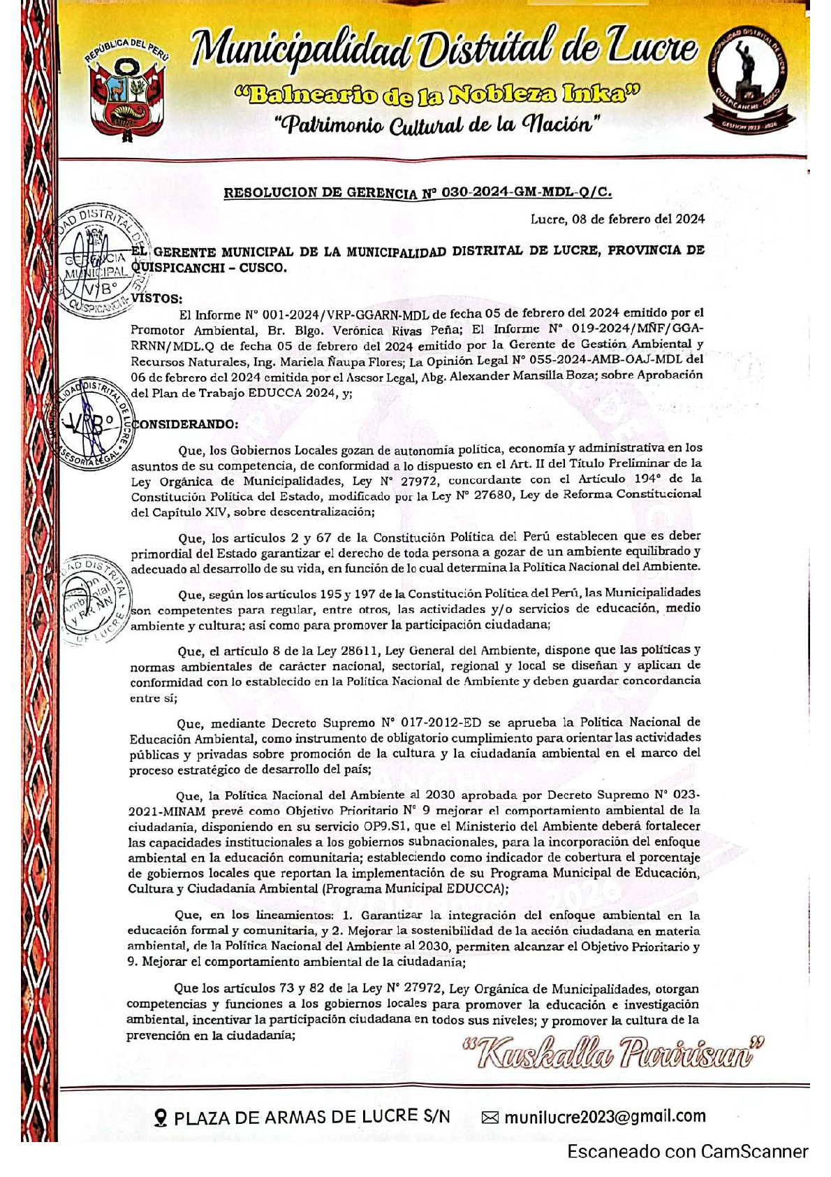 La presente Resolución de Gerencia Municipal aprueba el Plan de Trabajo 2024 del Programa Municipal de Educación, Cultura y Ciudadanía Ambiental de la Municipalidad Distrital de Lucre (Cusco), con la finalidad de definir las actividades de educación, cultura y ciudadanía ambiental que se desarrollaran en la localidad durante el presente año.