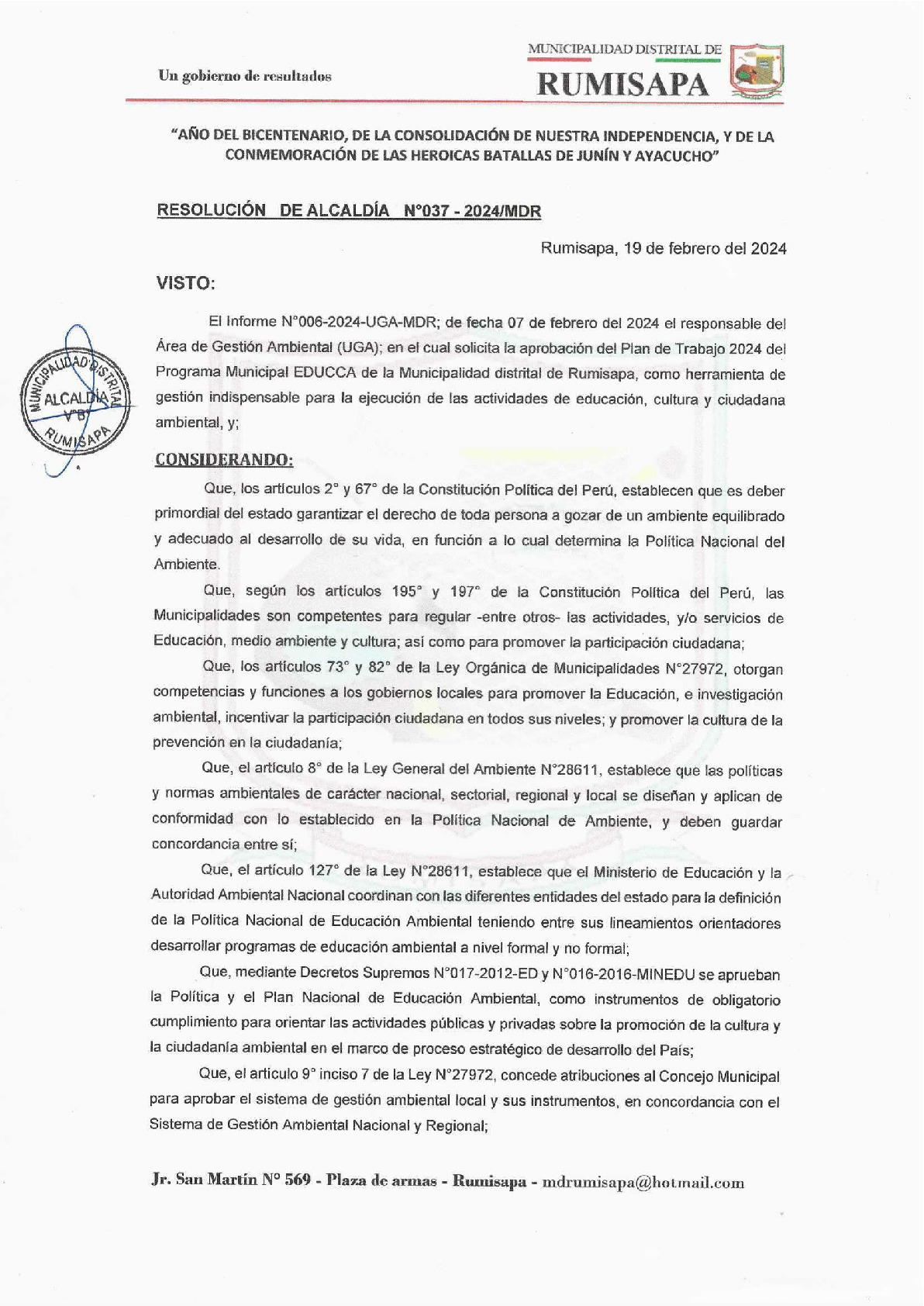 La presente Resolución de Alcaldía aprueba el Plan de Trabajo 2024 del Programa Municipal de Educación, Cultura y Ciudadanía Ambiental de la Municipalidad Distrital de Rumisapa - Lamas (San Martín), con la finalidad de definir las actividades de educación, cultura y ciudadanía ambiental que se desarrollaran en la localidad durante el presente año.