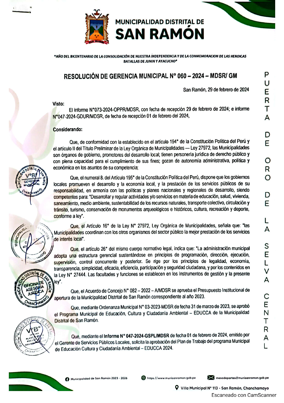 La presente Resolución de Gerencia Municipal aprueba el Plan de Trabajo 2024 del Programa Municipal de Educación, Cultura y Ciudadanía Ambiental de la Municipalidad Distrital de San Ramón (Junín), con la finalidad de definir las actividades de educación, cultura y ciudadanía ambiental que se desarrollaran en la localidad durante el presente año.