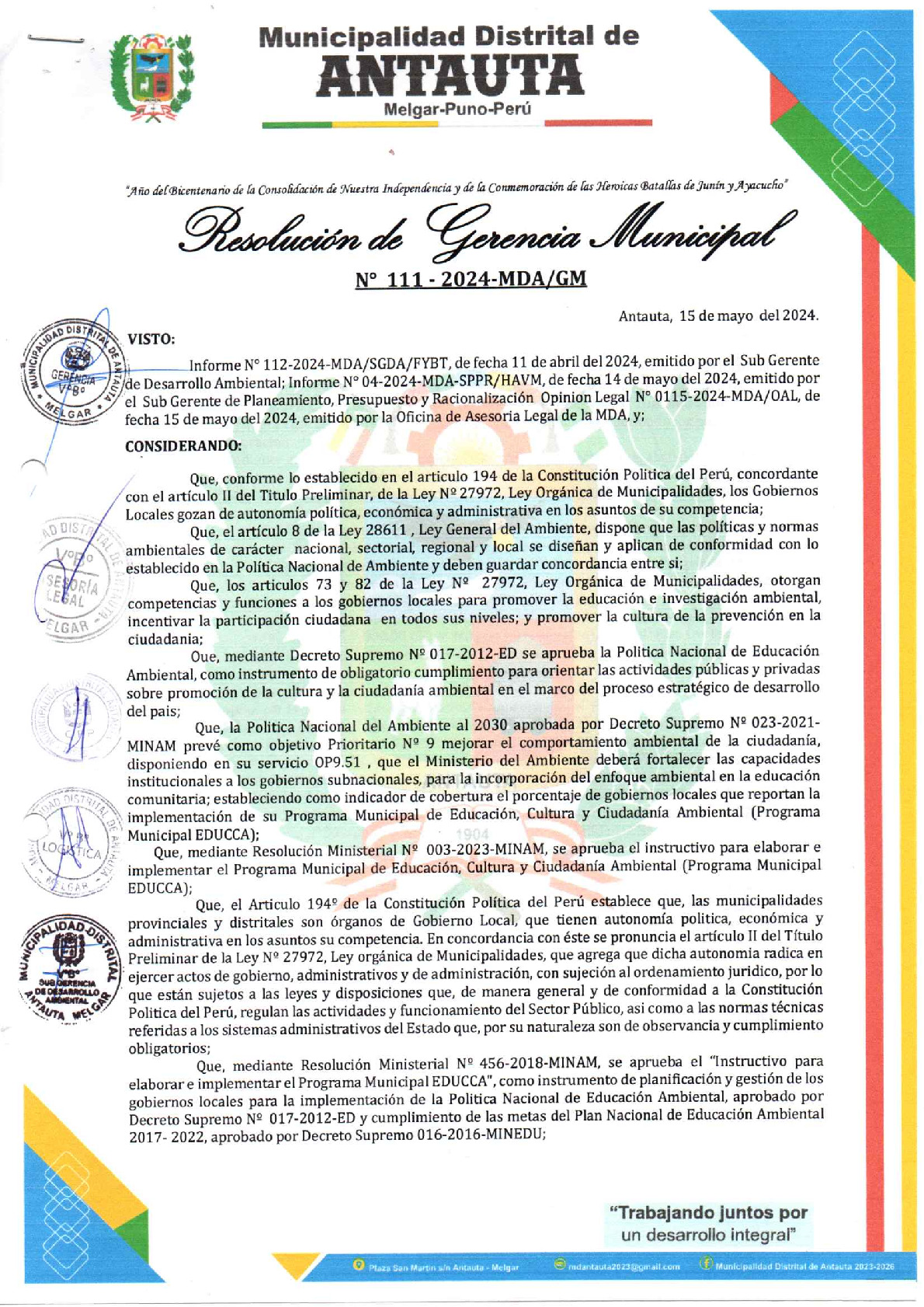 La presente Resolución de Gerencia Municipal aprueba el Plan de Trabajo 2024 del Programa Municipal de Educación, Cultura y Ciudadanía Ambiental de la Municipalidad Distrital de Antauta (Puno), con la finalidad de definir las actividades de educación, cultura y ciudadanía ambiental que se desarrollaran en la localidad durante el presente año.