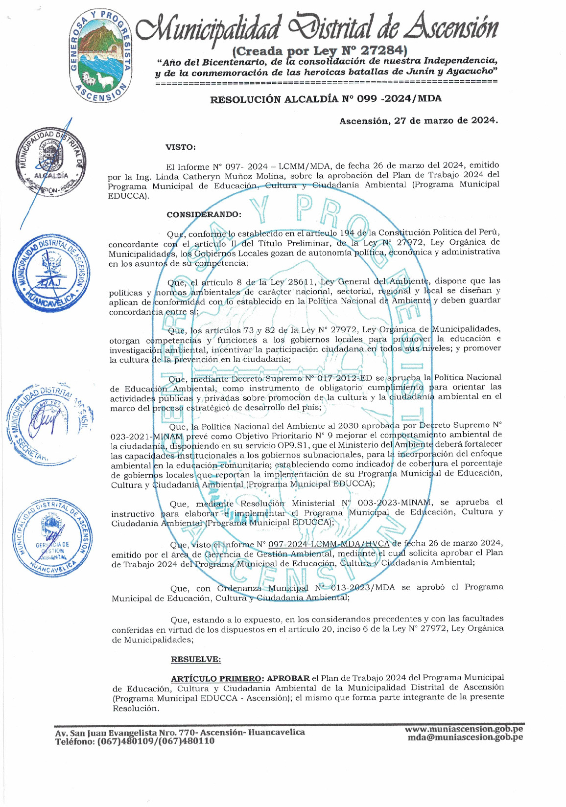 La presente Resolución de Alcaldía aprueba el Plan de Trabajo 2024 del Programa Municipal de Educación, Cultura y Ciudadanía Ambiental de la Municipalidad Distrital de Ascensión - (Huancavelica), con la finalidad de definir las actividades de educación, cultura y ciudadanía ambiental que se desarrollaran en la localidad durante el presente año.