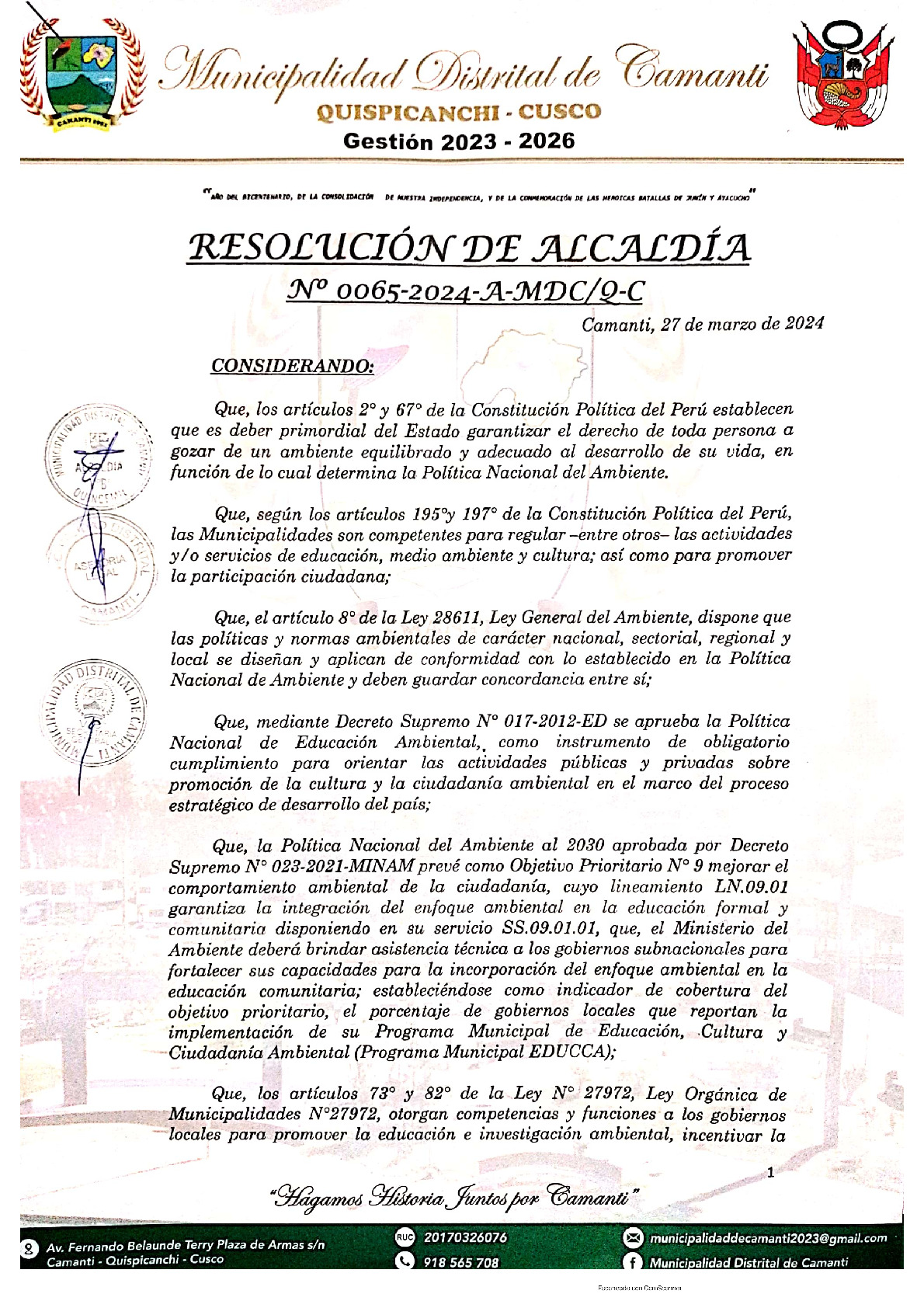 La presente Resolución de Alcaldía aprueba el Plan de Trabajo 2024 del Programa Municipal de Educación, Cultura y Ciudadanía Ambiental de la Municipalidad Distrital de Camanti (Cusco), con la finalidad de definir las actividades de educación, cultura y ciudadanía ambiental que se desarrollaran en la localidad durante el presente año.