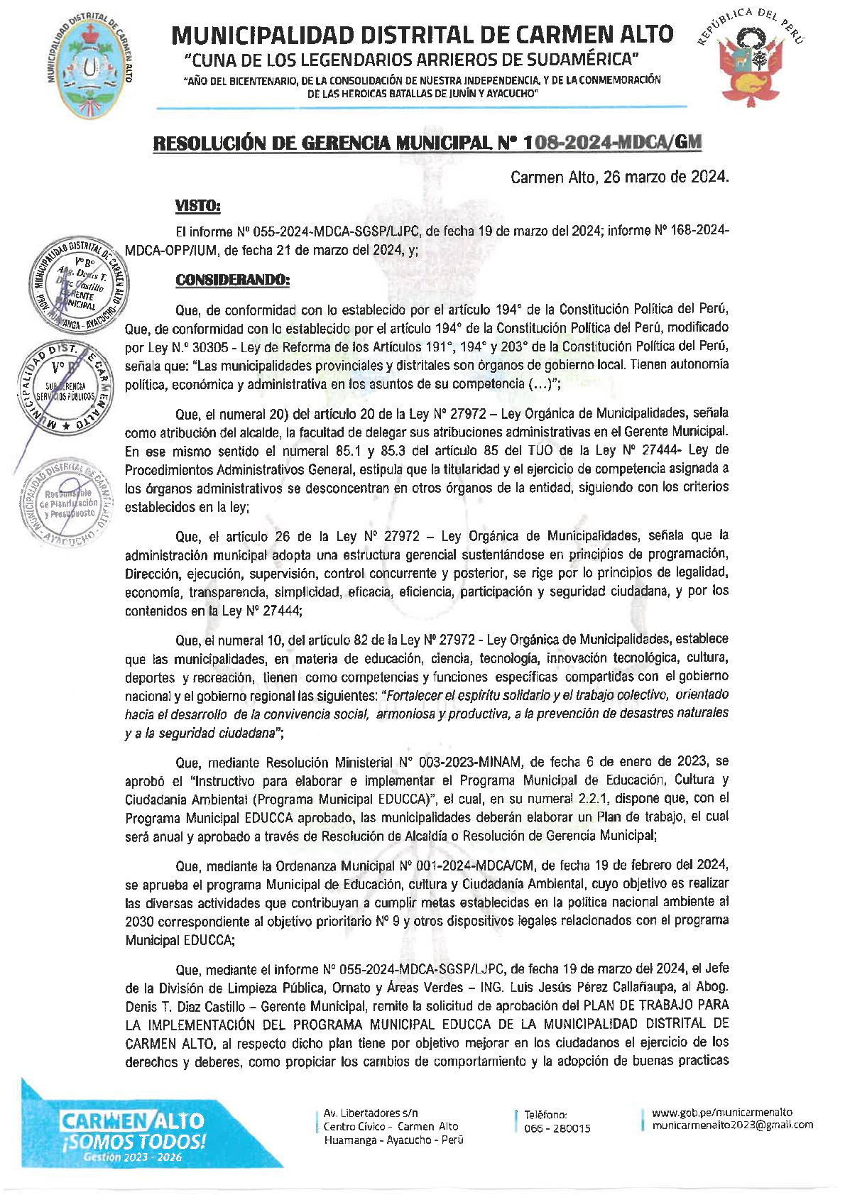 La presente Resolución de Gerencia Municipal aprueba el Plan de Trabajo 2024 del Programa Municipal de Educación, Cultura y Ciudadanía Ambiental de la Municipalidad Distrital de Carmen Alto (Ayacucho), con la finalidad de definir las actividades de educación, cultura y ciudadanía ambiental que se desarrollaran en la localidad durante el presente año.
