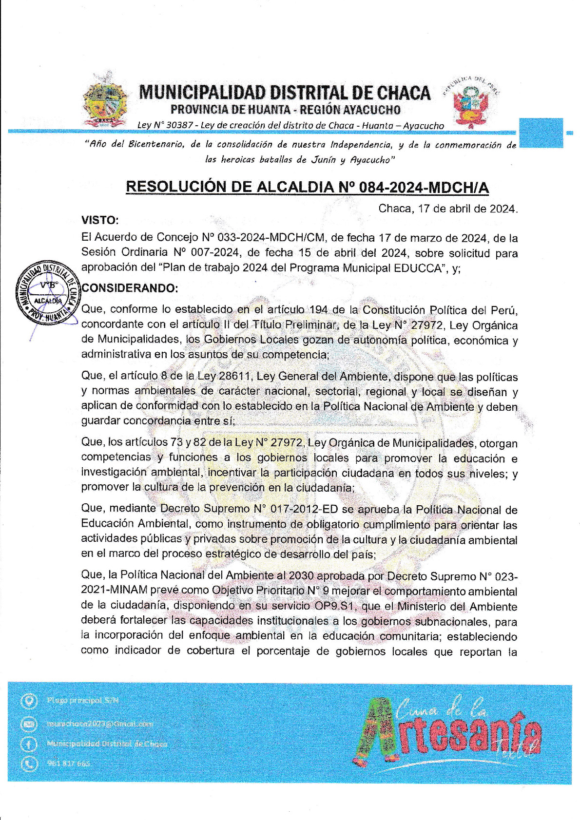 La presente Resolución de Alcaldía aprueba el Plan de Trabajo 2024 del Programa Municipal de Educación, Cultura y Ciudadanía Ambiental de la Municipalidad Distrital de Chaca - (Ayacucho), con la finalidad de definir las actividades de educación, cultura y ciudadanía ambiental que se desarrollaran en la localidad durante el presente año.